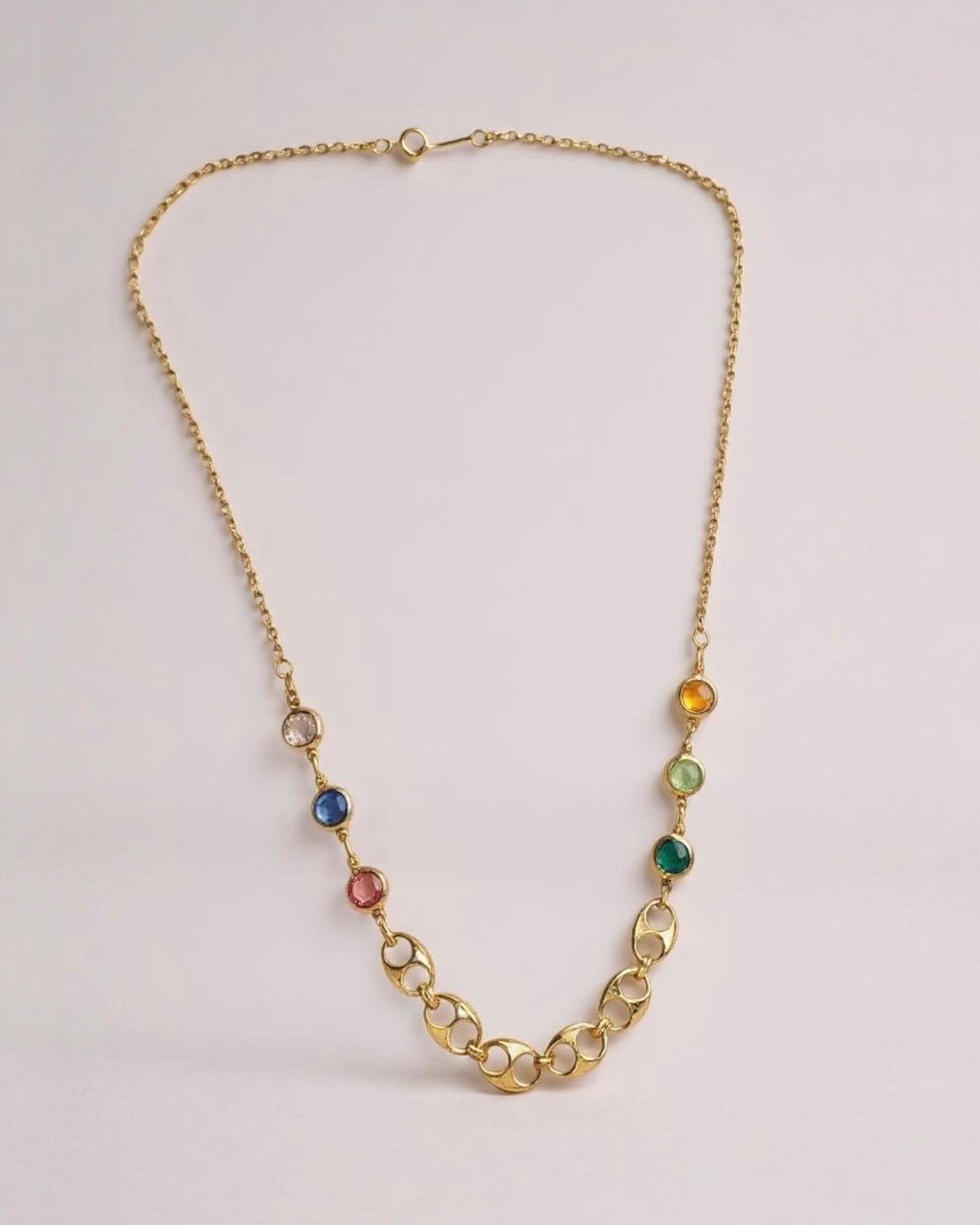 Adorn yourself with a truly radiant statement piece: an authentic vintage gold-plated necklace featuring a harmonious cascade of multi-colored crystal stations. Each circular, faceted crystal, in hues ranging from deep sapphire to vibrant emerald and warm ruby, is meticulously set within its own gleaming gold-toned bezel. The substantial, polished chain flows gracefully, creating a luxurious drape around the neckline.