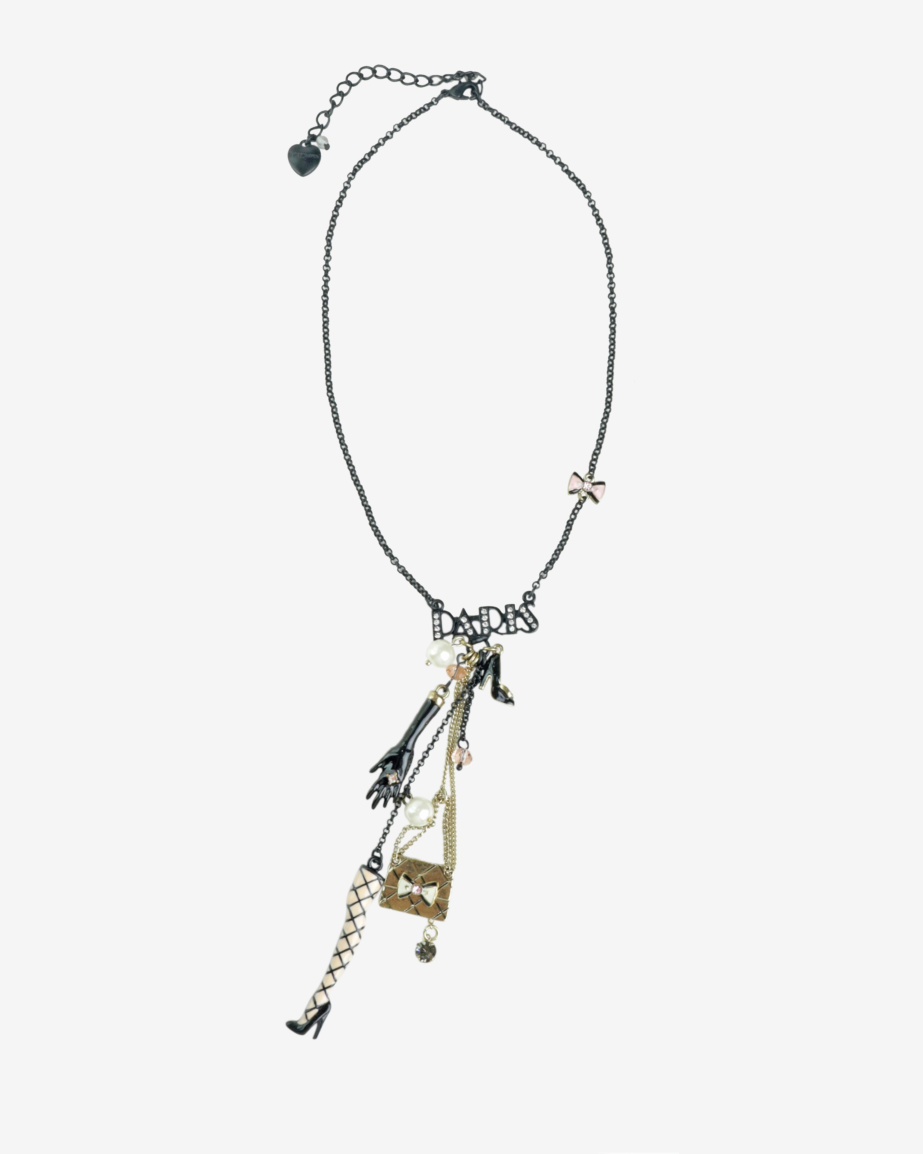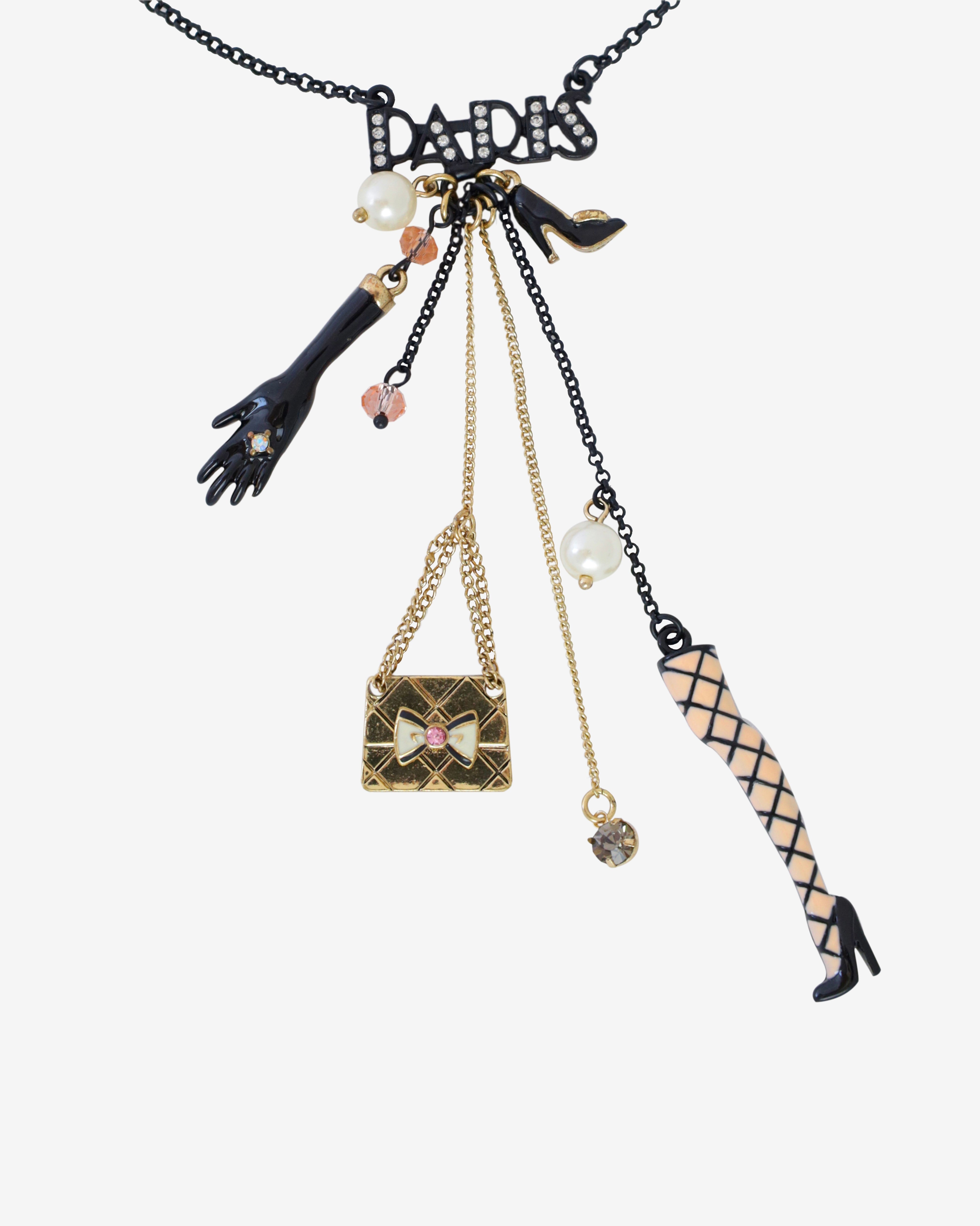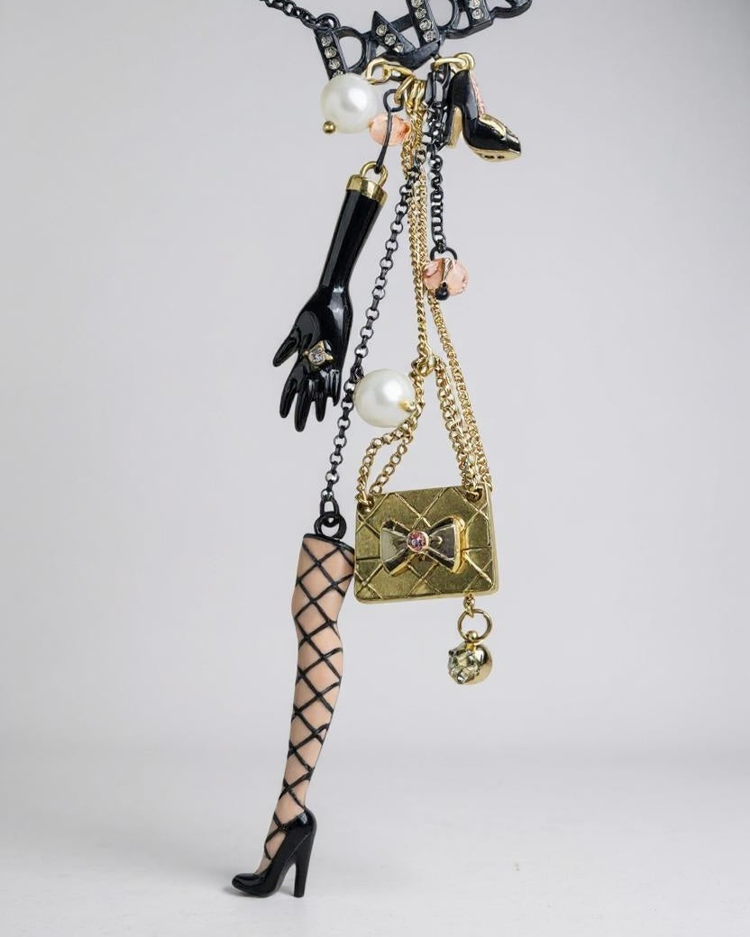 This Betsey Johnson statement necklace is the ultimate mix of playful glamour and edgy femininity! Featuring a bold assortment of charms a black-gloved hand, fishnet-stocking leg, high heel, quilted handbag, pearls, and sparkling crystal this piece embodies Betsey Johnson signature whimsical-meets-rebellious style.