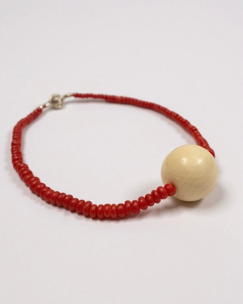 This striking bracelet features a bold design that balances history with craftsmanship. The piece is composed of vibrant red Murano glass beads, each individually handcrafted in Italy, strung together to create a vivid band of color. At its center rests a single antique elephant ivory bead, polished to a smooth finish, lending contrast and gravitas to the design.