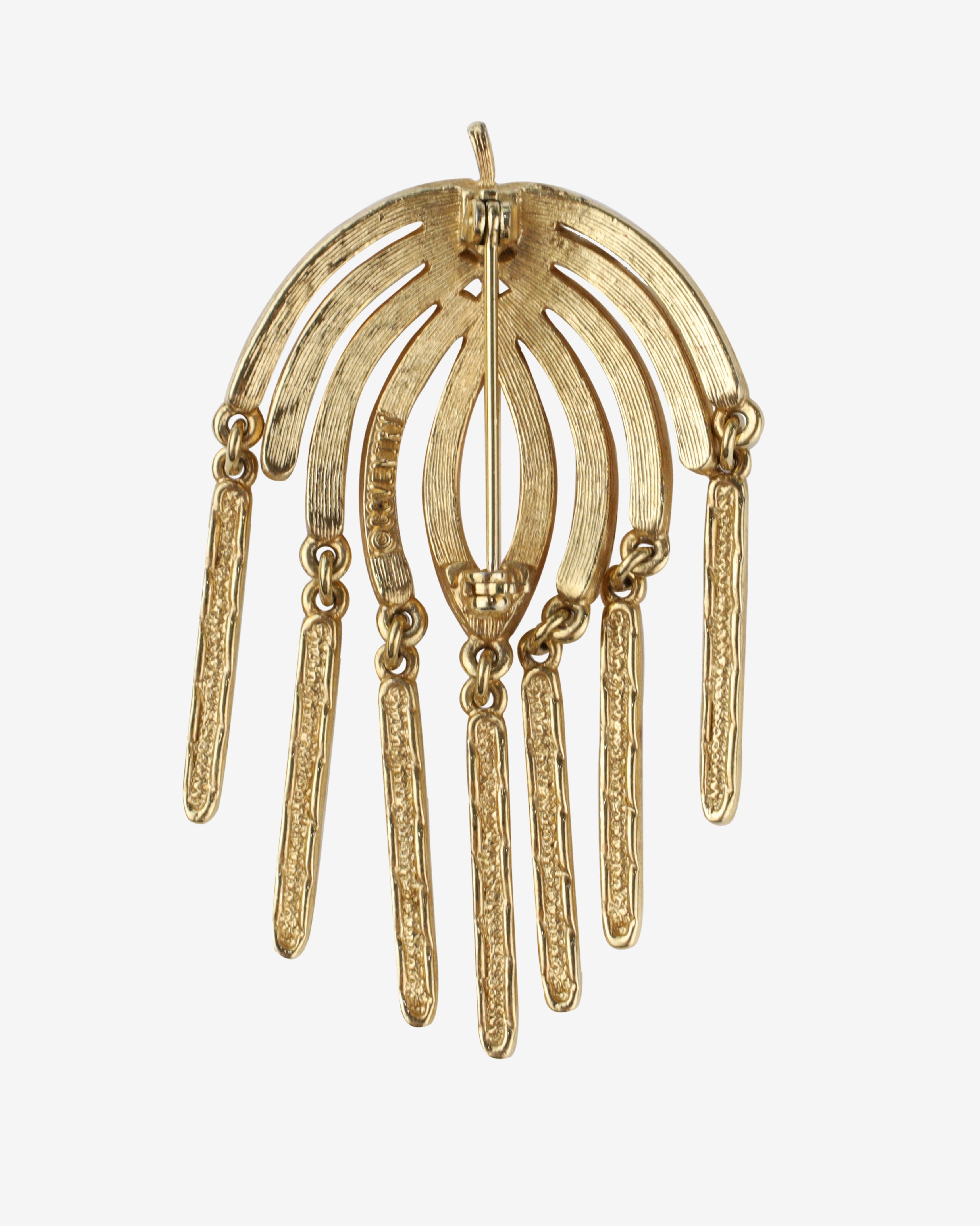 Add a touch of vintage elegance to your collection with this stunning 1970s Sarah Coventry Willow Dangle Brooch. Crafted in a beautiful gold tone with a textured finish, this pin features graceful dangles that create a sense of motion. Measuring approximately 2 1/4 inches in length, it is in excellent vintage condition and boasts working hardware and a straight pin for secure wear.