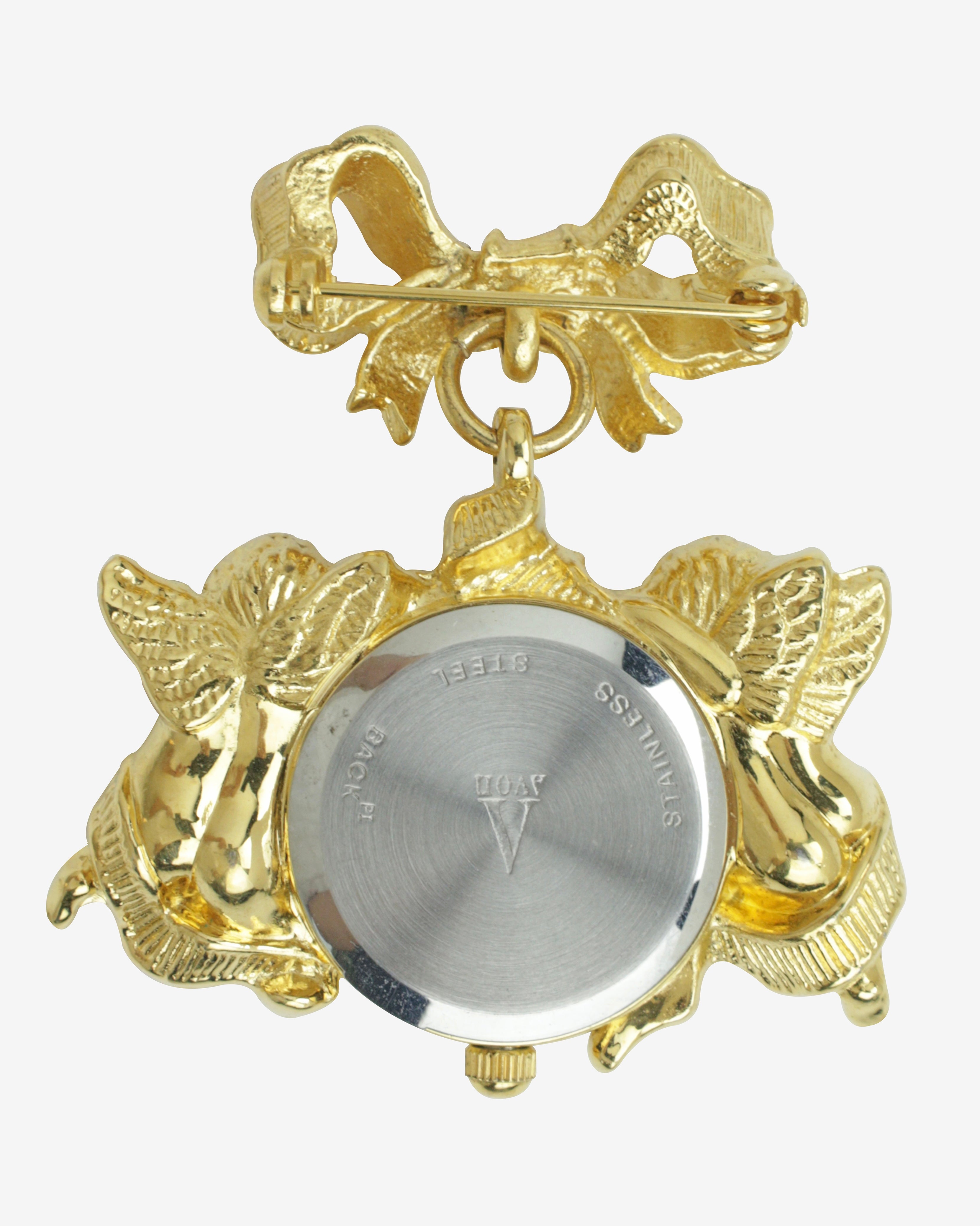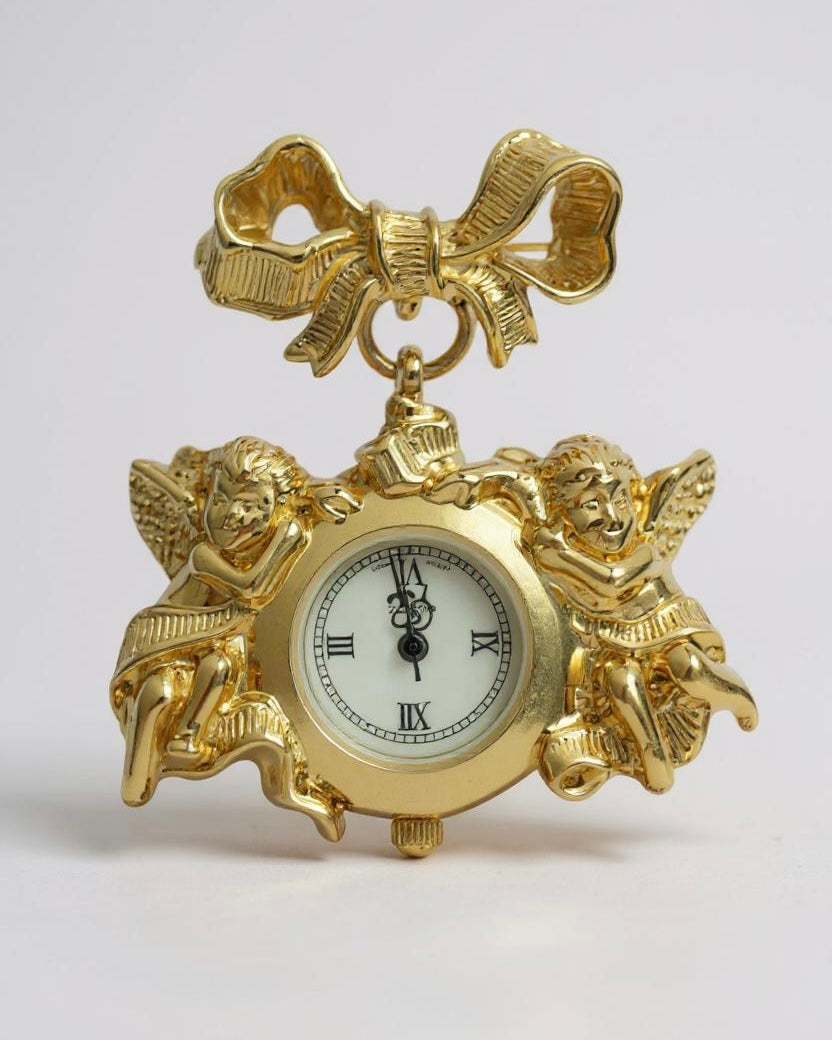 Elevate your accessory collection with this stunning Avon Vintage Watch Clock Pin Brooch! This exquisite piece features a whimsical design showcasing a cherub angel delicately perched beside a gold-tone bow, complete with a functioning watch clock. Crafted in the 1990s, this signed brooch combines elegance and charm, making it a perfect statement piece for any occasion. Whether you're dressing up for a special event or adding flair to your everyday attire, this unique accessory is sure to turn heads.