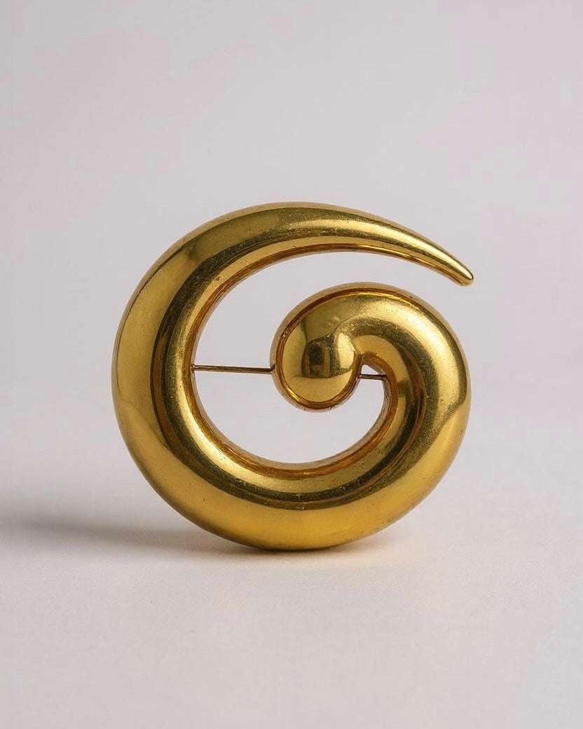 This particular brooch, with its bold, fluid swirl design, reflects the clean lines and sculptural forms popular in 1970s modernist art and fashion. It was likely cherished by a woman who appreciated contemporary design and sought accessories that offered both elegance and a distinct point of view. A statement piece then, as it is now, it would have added a touch of refined avant-garde flair to everything from a classic blazer to an evening gown.