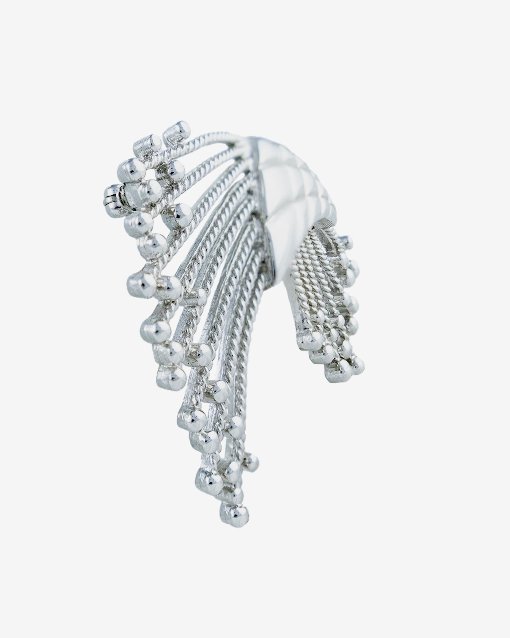 Monet, a name synonymous with accessible luxury since 1937, pioneered techniques like triple-plating, ensuring their pieces, like this one, maintained a brilliant, long-lasting finish. This particular brooch features a captivating fan-shaped motif with intricate, textured detailing, gracefully fanning out into delicate dangles adorned with polished silver-toned beads. The sculptural form and radiant silver tone make it a versatile statement accessory, perfect for adding a touch of vintage glamour to any modern outfit.