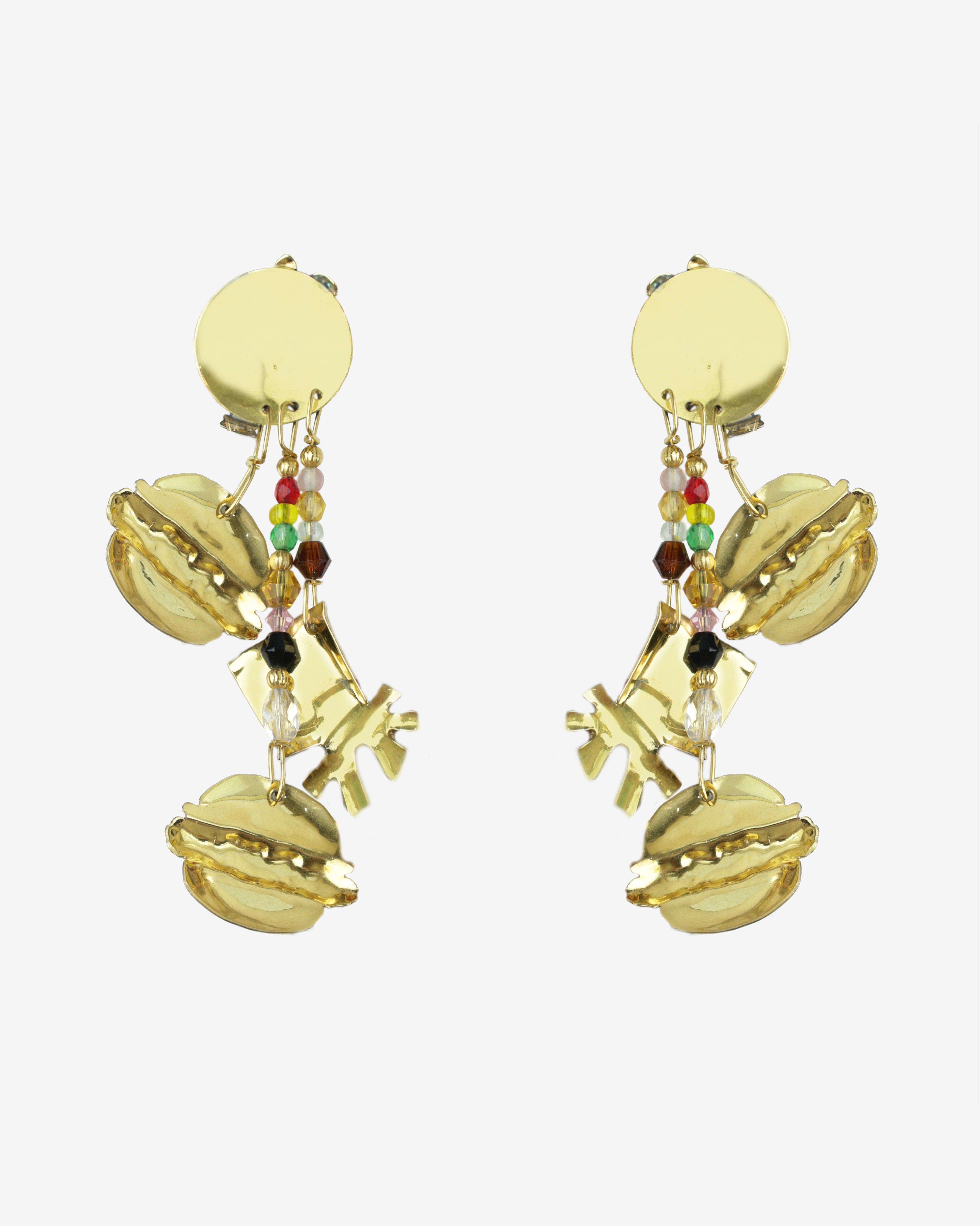 These playful statement earrings bring a nostalgic twist with their vibrant and quirky diner-inspired design. Featuring hand-painted milkshake studs, cascading crystal beads, and glittering cheeseburger and fries charms, they capture the fun and indulgence of a classic American diner. The mix of bold colors, whimsical details, and vintage flair makes them a conversation-starting accessory for those who love bold, unique jewelry. Perfect for adding a touch of retro charm and personality to any look!