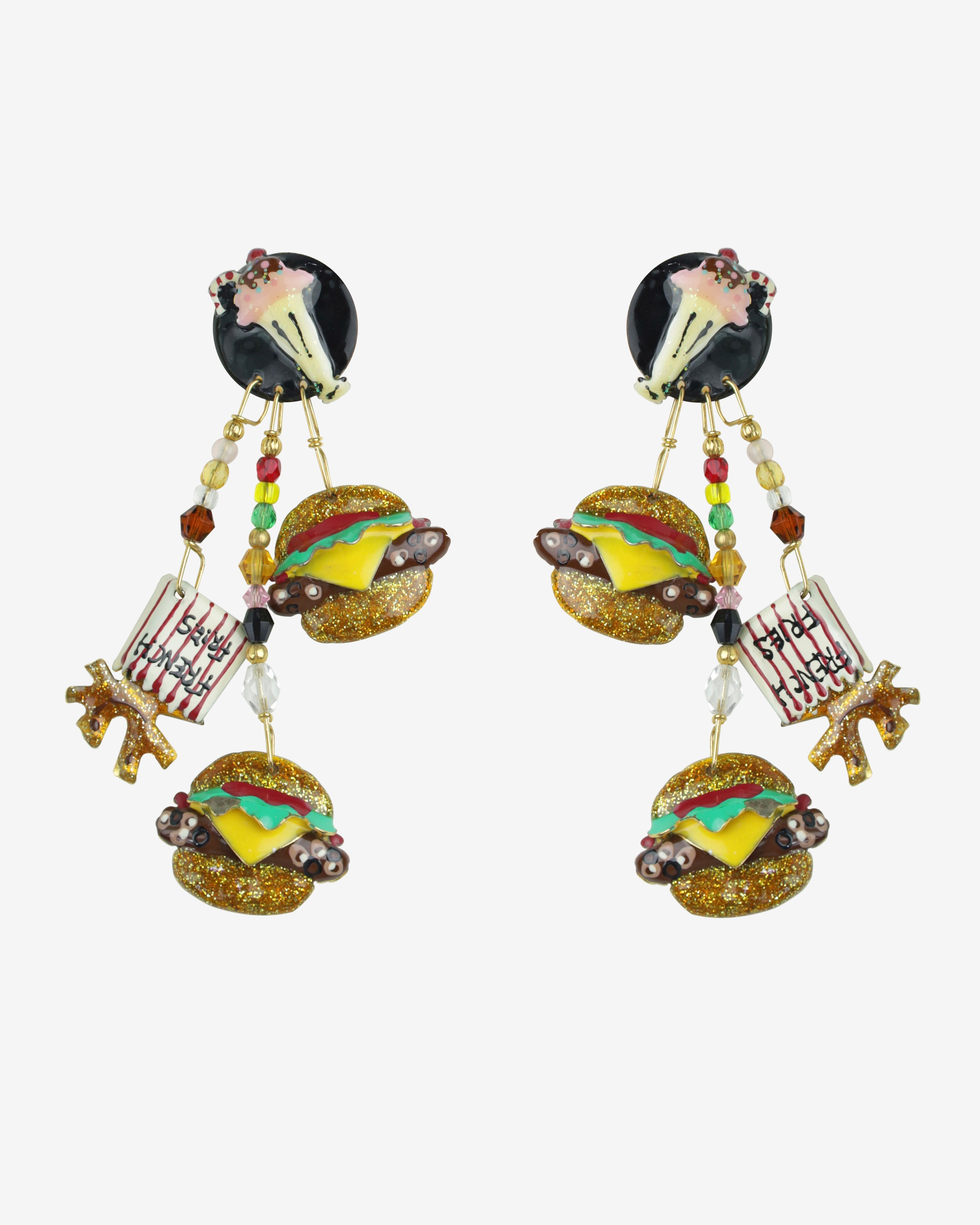 These earrings celebrate the golden era of classic American diners, where milkshakes, cheeseburgers, and fries were more than just food—they were symbols of fun, friendship, and carefree moments. Inspired by the 1950s diner culture, they evoke a sense of nostalgia for jukebox tunes, soda fountains, and the joy of sharing a meal in a cozy booth. Each charm is thoughtfully designed to bring this vibrant energy to life, making these earrings a playful tribute to vintage Americana and the timeless love for comfort food.