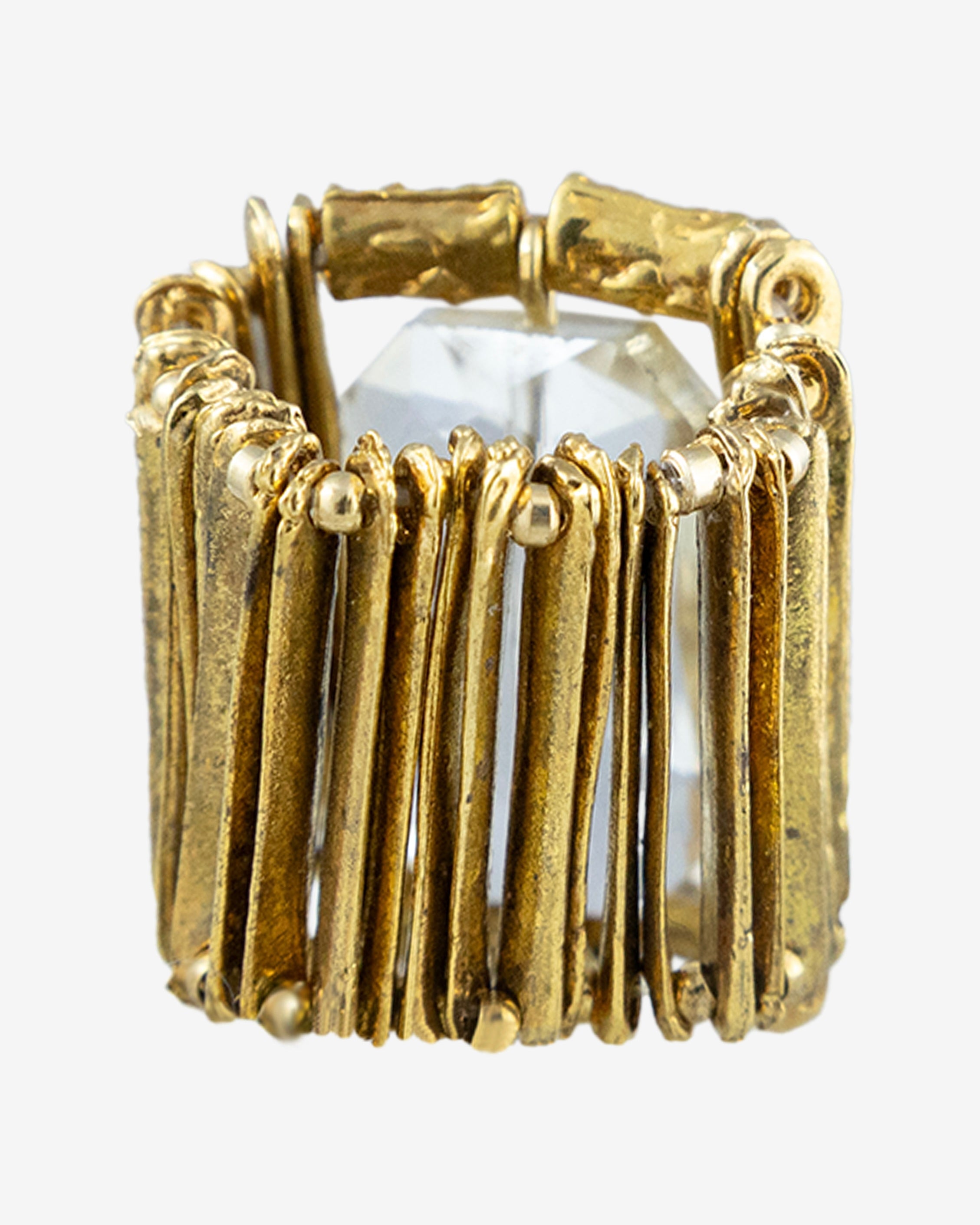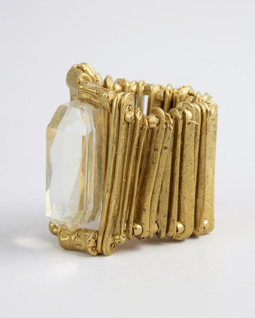 Each piece is meticulously crafted with substantial, rectangular faceted clear crystals that command attention, reminiscent of polished gemstones. These brilliant crystals are securely set within robust, richly textured gold-tone frameworks that exude a powerful, almost sculptural elegance. The necklace features a series of these crystal-framed links, interspersed with solid gold-tone bars, creating a structured, graduated collar that sits regally on the neckline. The matching bracelet echoes this distinctive design, ensuring a cohesive and impactful look. The accompanying ring makes a powerful statement on the finger, featuring a prominent rectangular crystal within a similarly textured gold-tone setting, perfectly tying the collection together with an air of coordinated luxury.