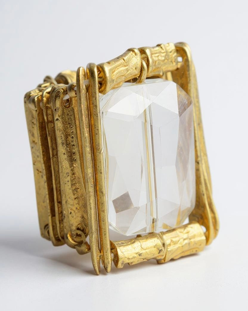 * "Architectural Glamour" Design (1980s-1990s): Bold, structured forms featuring prominent rectangular clear crystals within textured gold-tone settings, reflecting the influential aesthetic of the period.