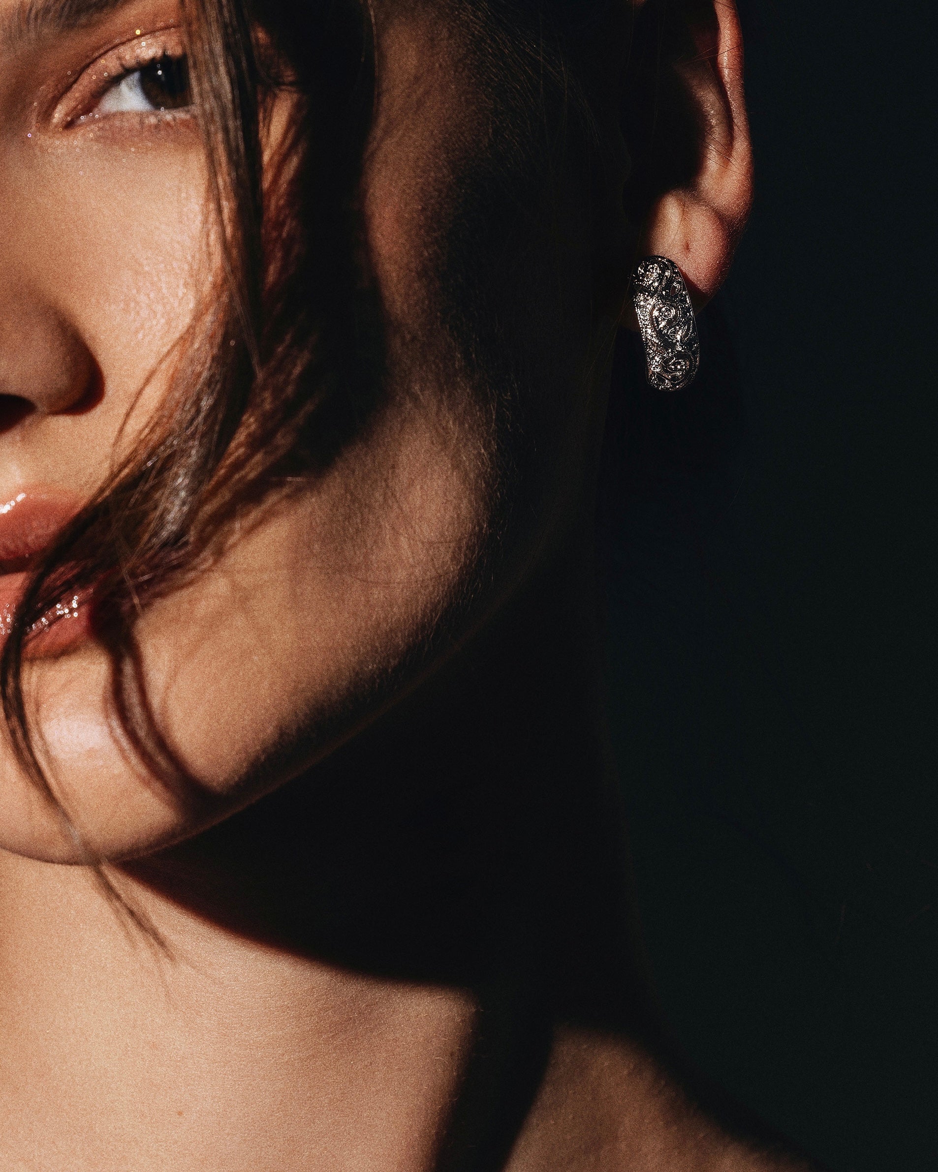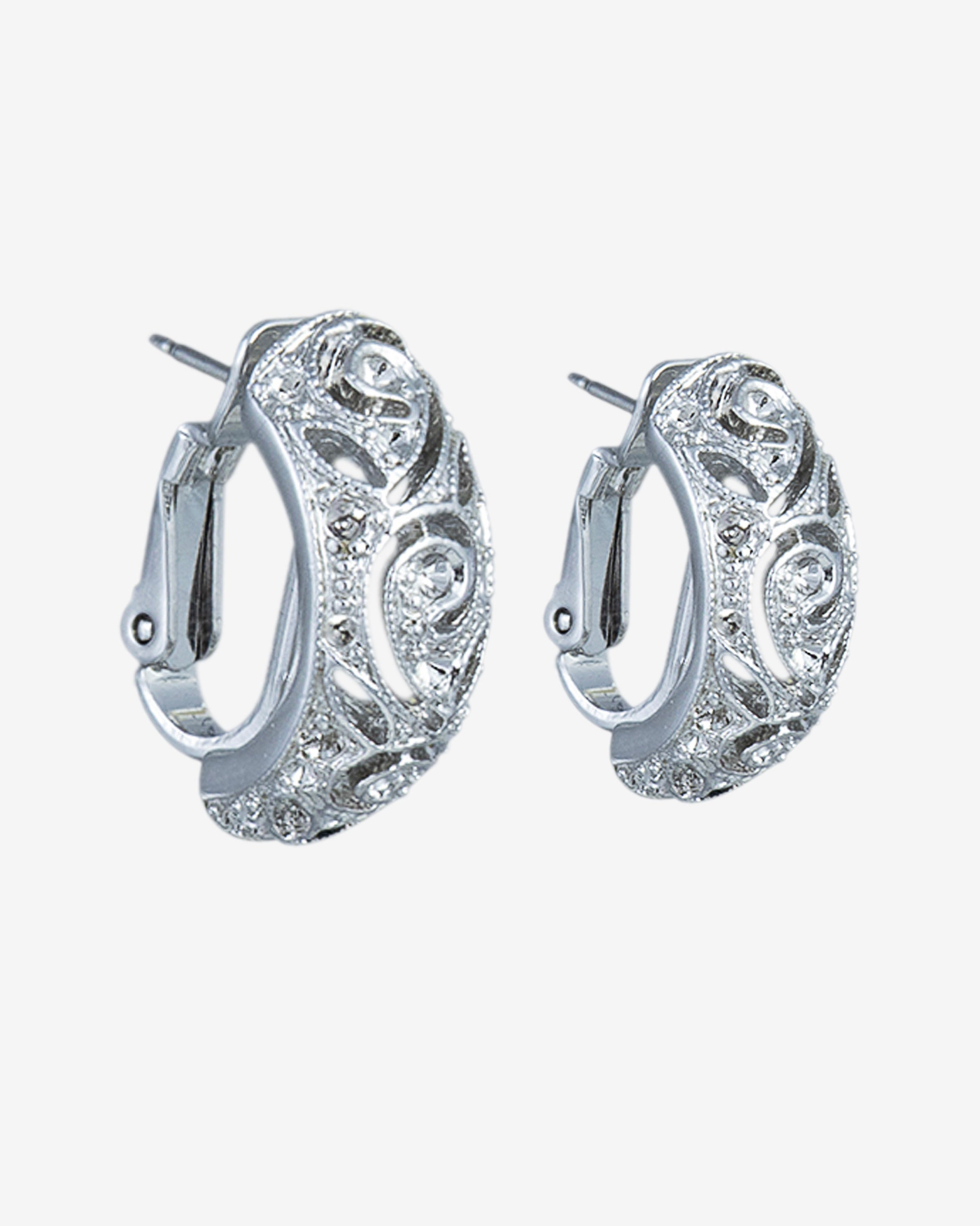 Filigree jewelry dates back centuries, prized for its lace-like metalwork and feminine charm. In the Victorian period (1837–1901), such delicate designs symbolized refinement and romanticism. Hoop earrings with ornate detail were often worn during the late 19th century as a statement of both fashion and status. The revival of Victorian motifs in late 20th-century and early 21st-century costume jewelry brought this intricate style back into fashion, blending antique inspiration with modern finishes like platinum plating and precision-cut crystals. These earrings reflect that timeless blend—evoking the grace of a bygone era with the ease and shine of contemporary craftsmanship.