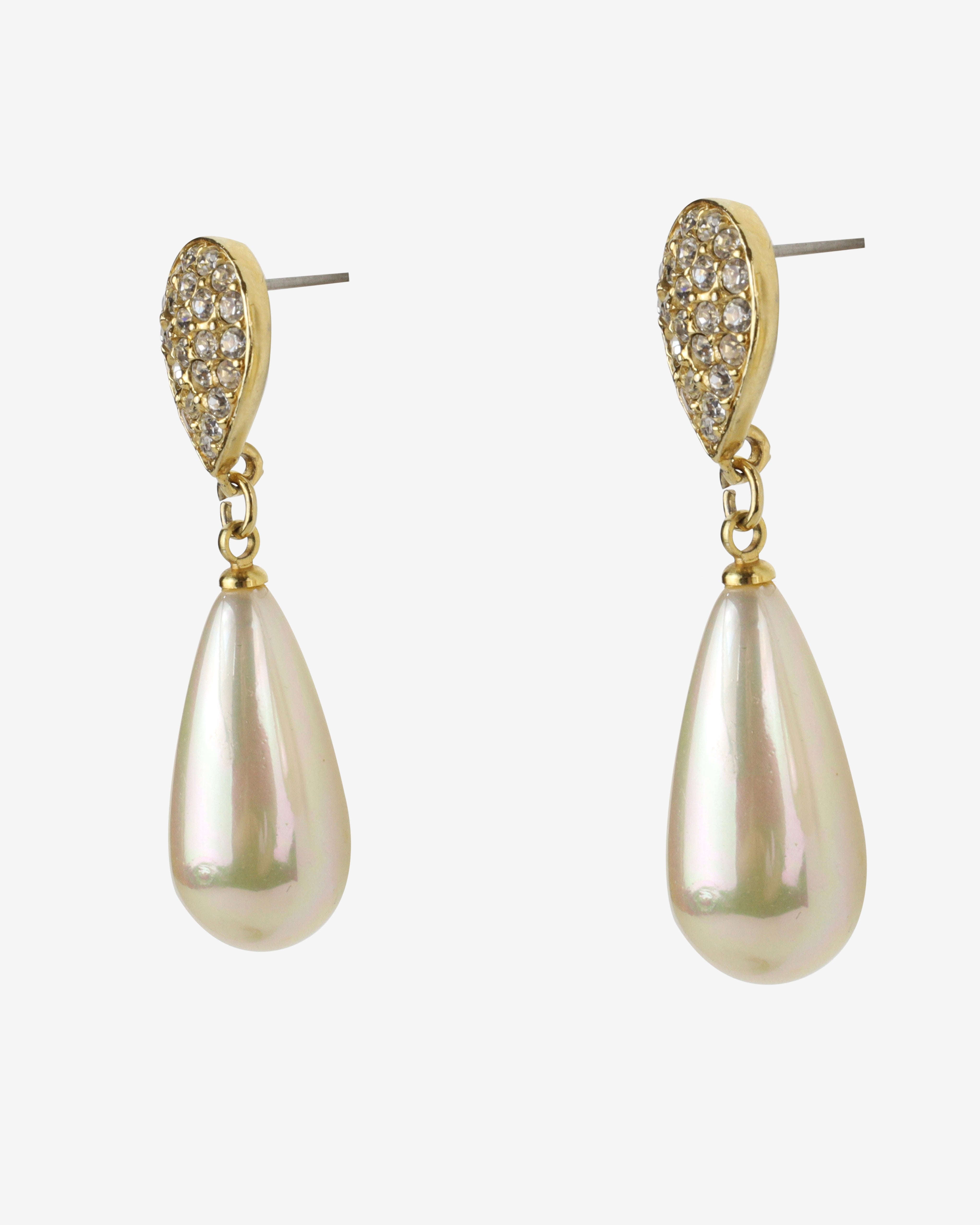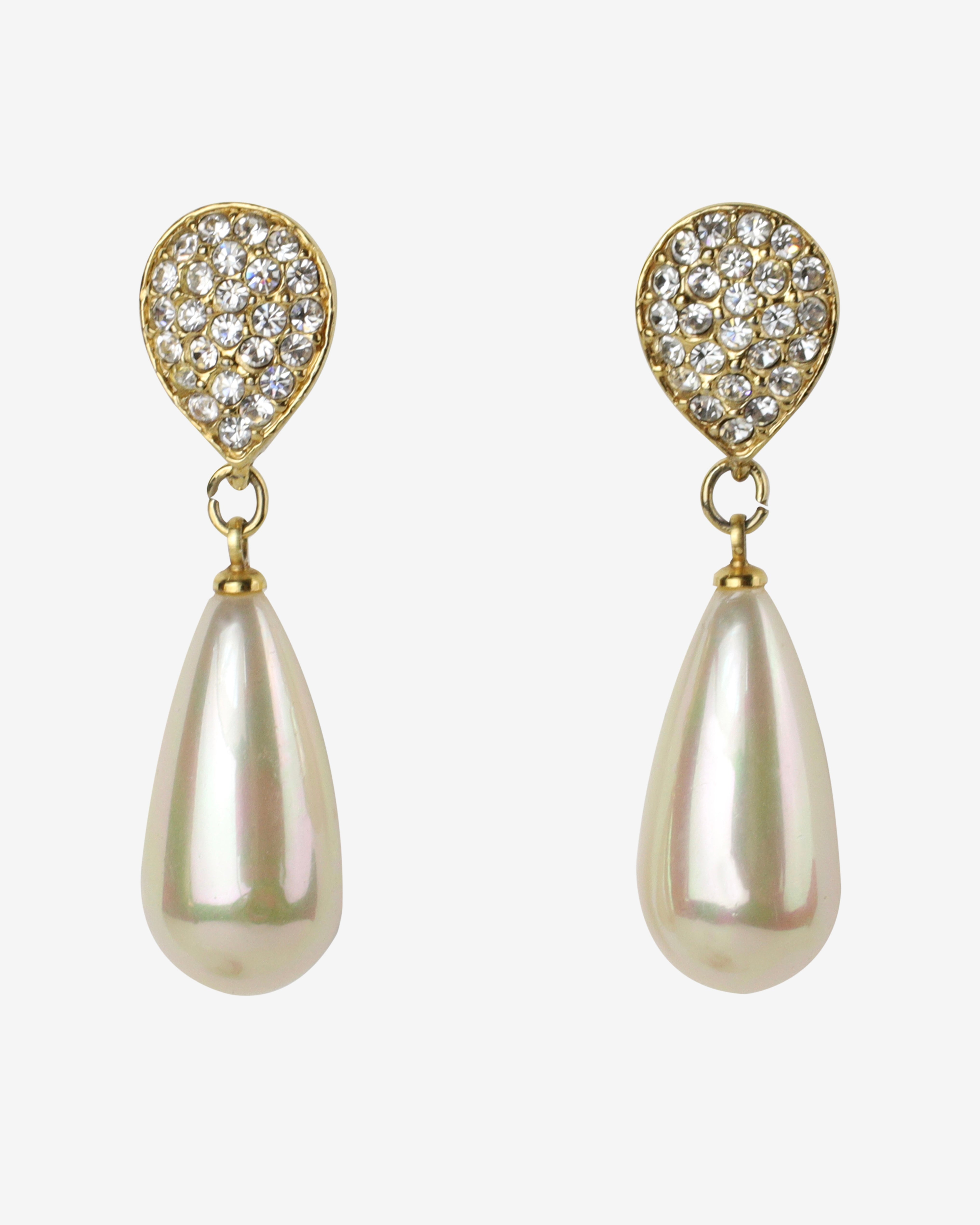 Elevate your accessory game with these exquisite 1970s Vintage Roman dressy earrings. Featuring a stunning 1.5-inch drop, these earrings showcase a brilliant clear round rhinestone set in elegant gold-tone metal. The pièce de résistance is the lovely imitation pearl teardrop dangle that adds a touch of sophistication to any outfit. Marked with the iconic ""ROMAN,"" these earrings are a testament to timeless style and craftsmanship.