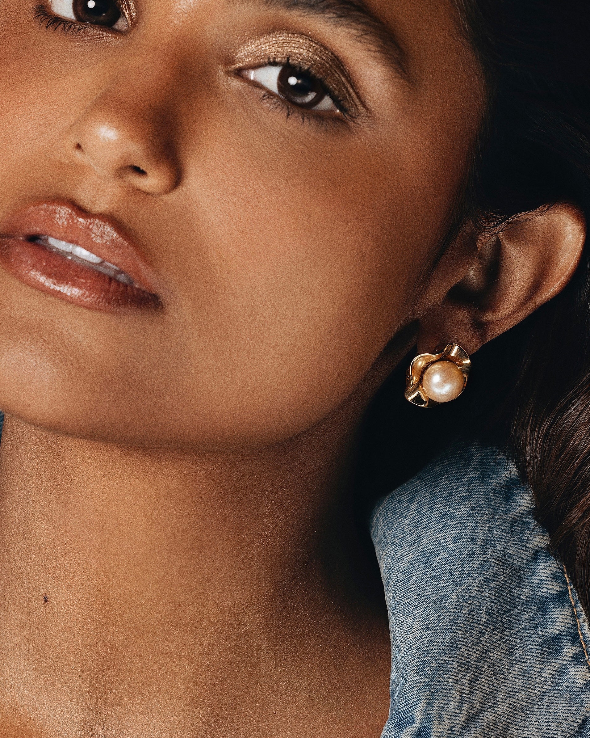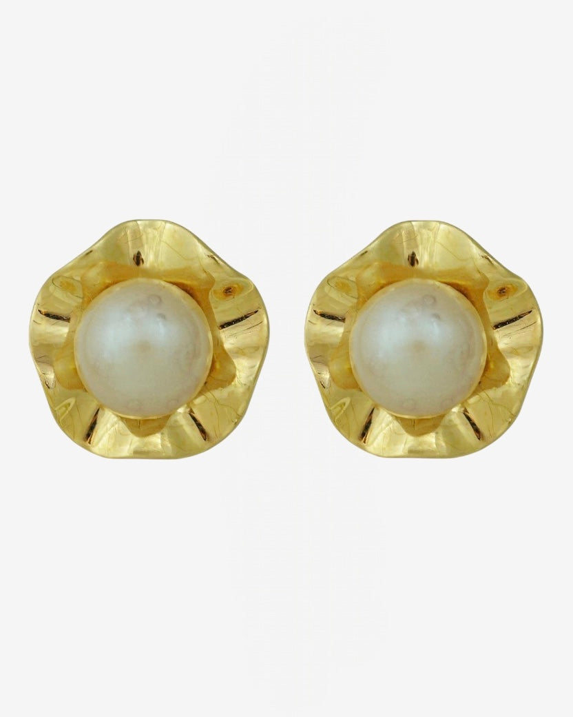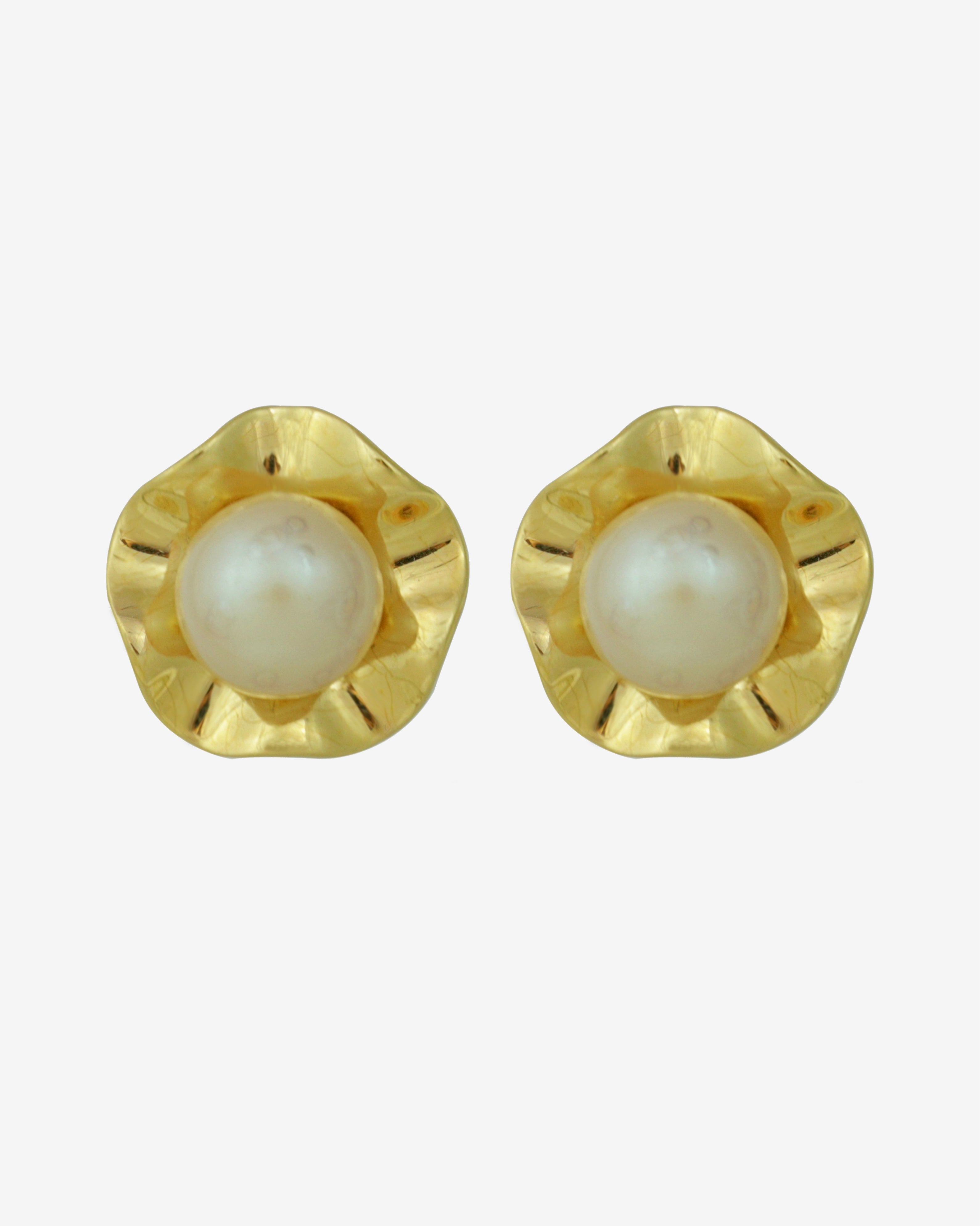 Vintage Nina Ricci clip-on earrings from the 1980s. These elegant earrings feature a beautifully designed gold-plated setting with delicate, textured scalloped edges. A luminous, creamy pearl sits at the center of each earring. A perfect example of Nina Ricci's classic French style and high-end craftsmanship.