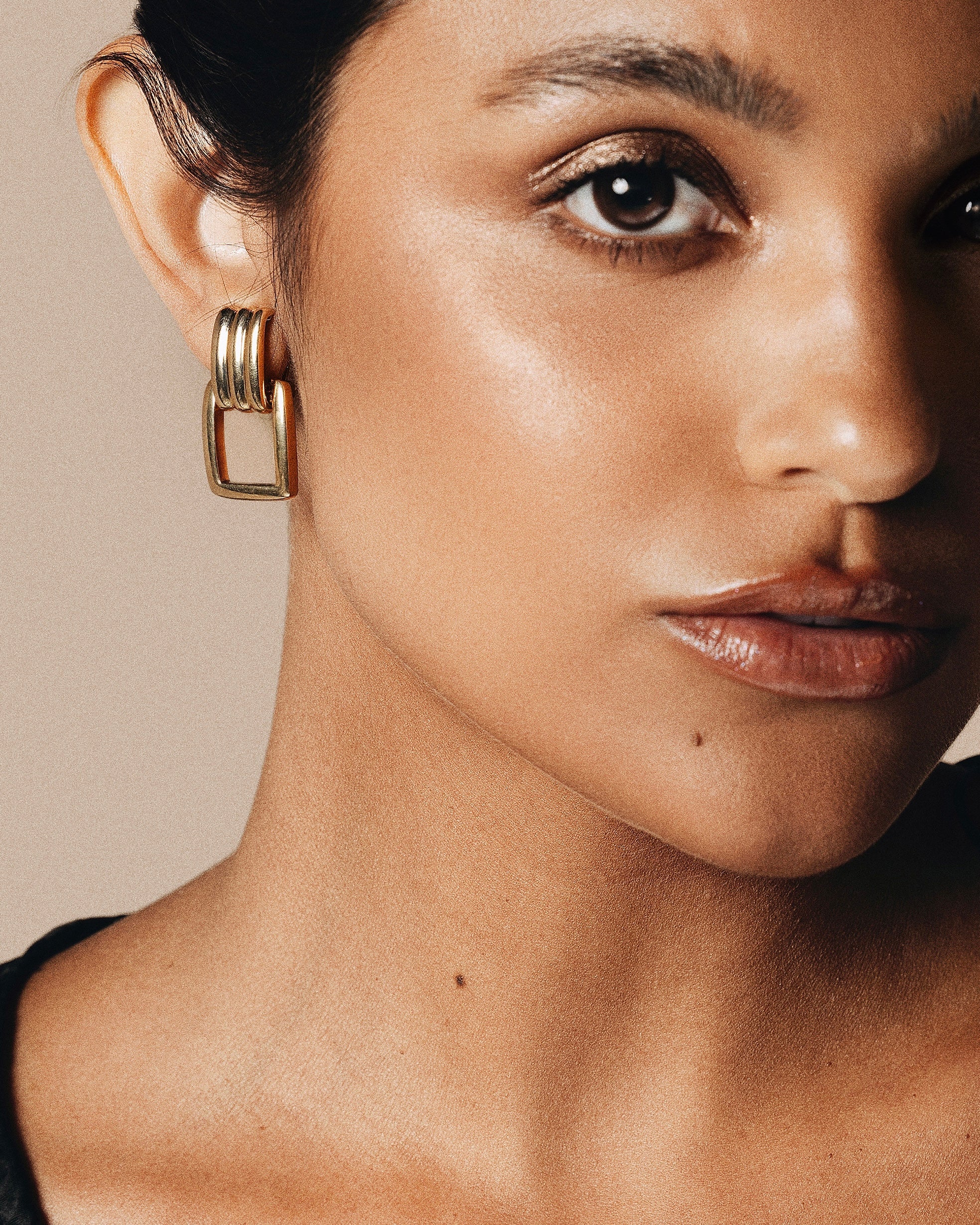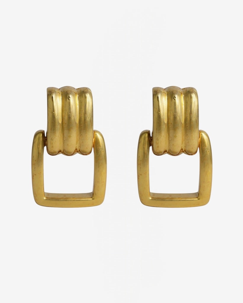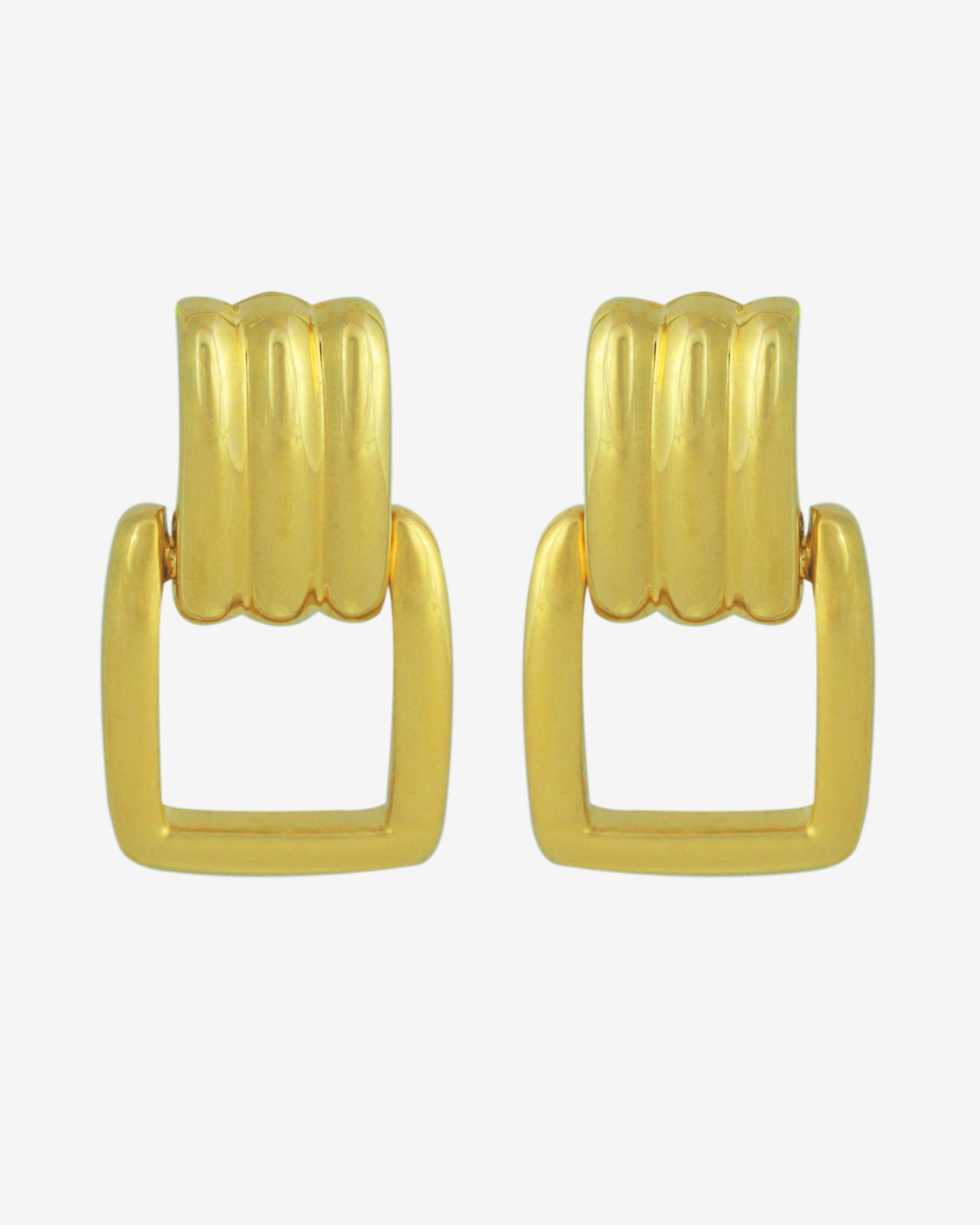 These vintage door knocker-style earrings feature a bold, sculptural design with a luxurious triple gold-plated finish. Measuring approximately 4.5 cm in length, they offer a dramatic yet refined statement with their classic oval top and swinging loop detail. The clip-on backs provide a secure and comfortable fit, ideal for non-pierced ears. With their glossy finish and elegant weight, these earrings are perfect for elevating both daytime and evening looks.
