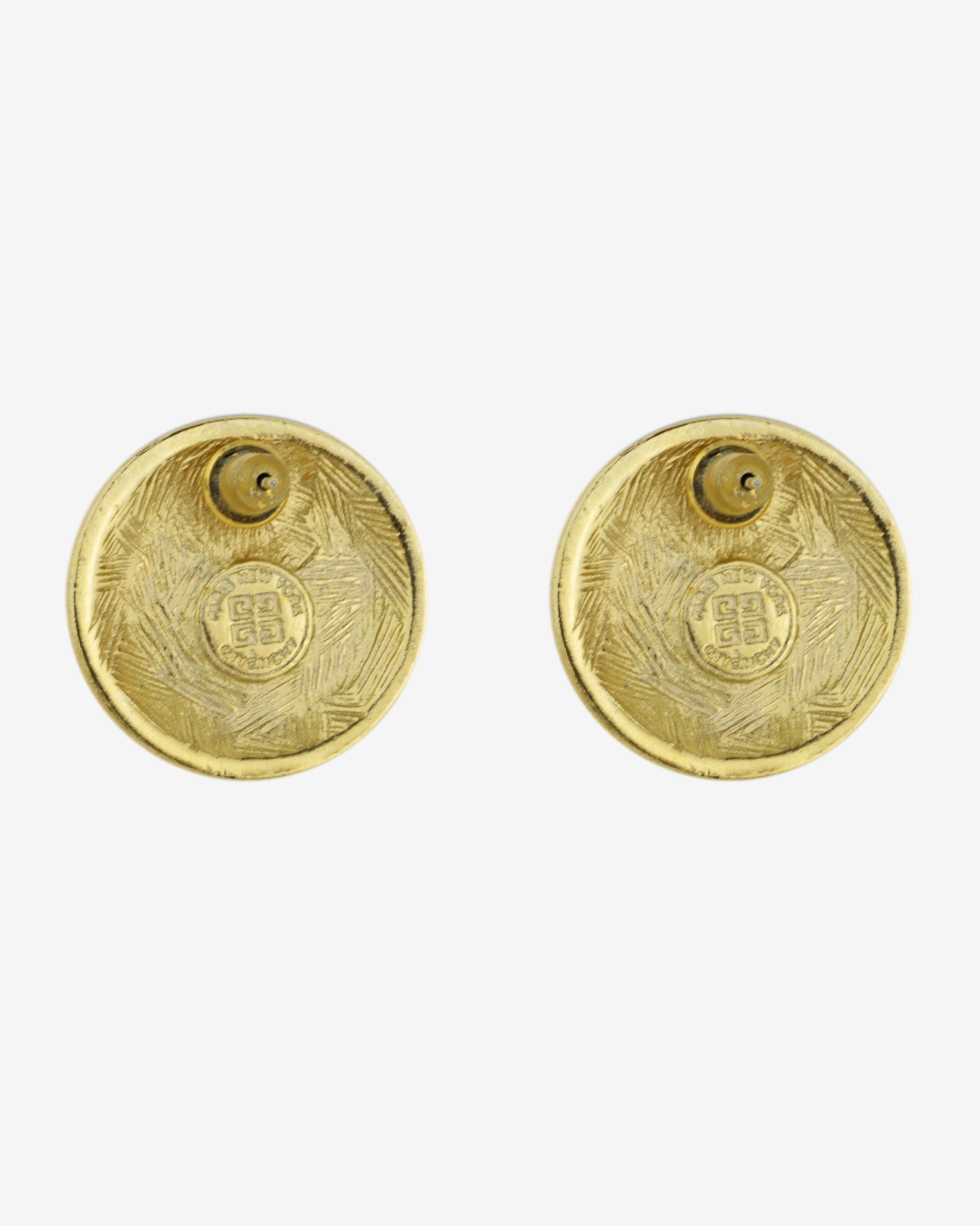 Elevate your accessory game with these stunning 1980s Vintage GIVENCHY Gold Tone Round Logo Earrings. Featuring the iconic Greek Key 4G design, these pierced post earrings blend timeless sophistication with a modern edge. Measuring 15/16" in diameter and 3.8mm in thickness, they are the perfect statement pieces for any occasion.