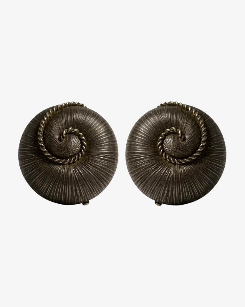 Step into a realm of ancient artistry with these striking Vintage Inspired Thai Siam Sterling Silver Clip-On Earrings. Crafted with meticulous detail, these unique earrings feature a captivating spiral design reminiscent of a conch shell or other natural marine forms. The antiqued sterling silver finish beautifully highlights the intricate textured lines and the central coiled element, giving them a rich, organic, and timeless appearance.