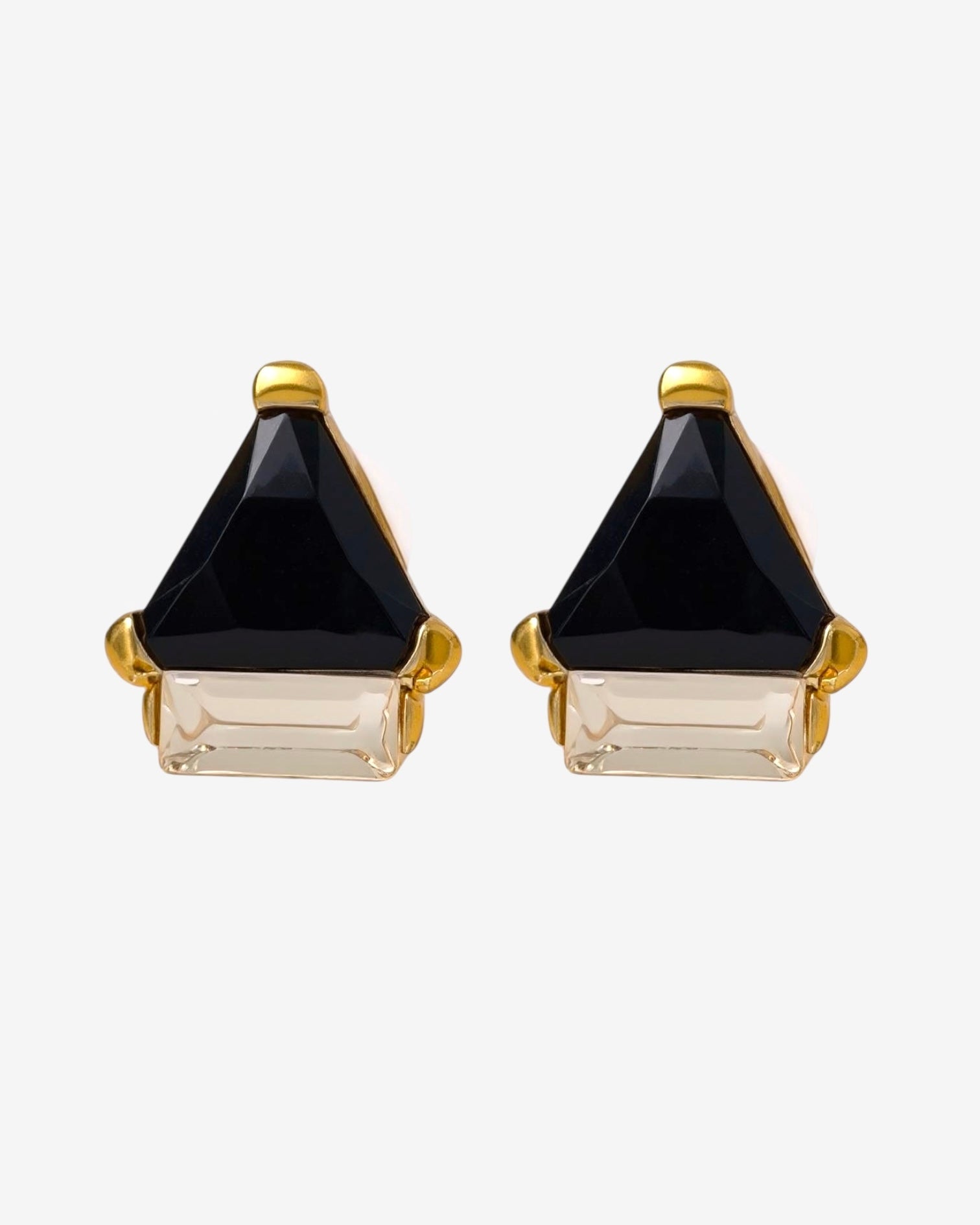 Bold yet refined, these vintage French stud earrings blend a jet-black triangular stone with a crisp white rectangular crystal, both set in luxurious triple gold plating. The geometric contrast and clean lines create a striking statement — elegant, sculptural, and effortlessly chic.