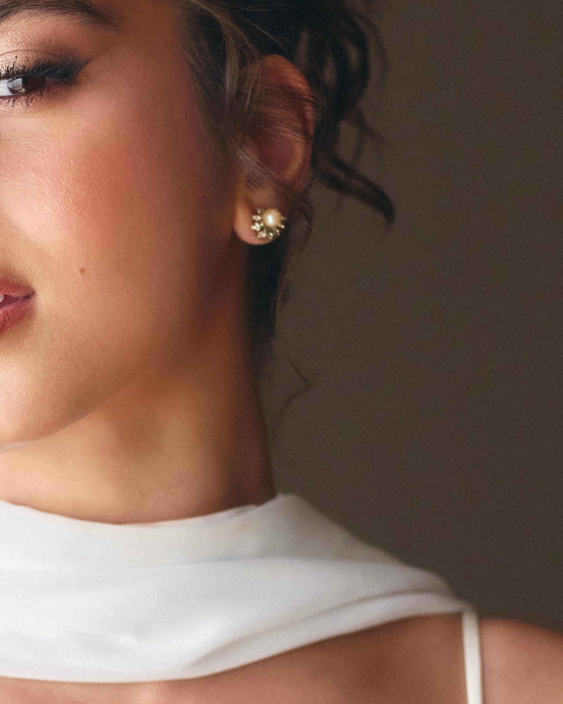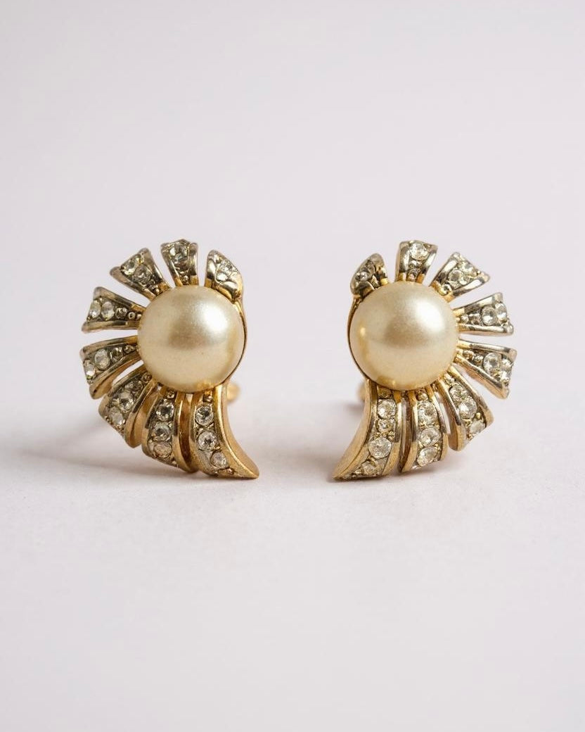 Step into a world of timeless allure with this truly radiant pair of authentic vintage studs earrings. Each earring showcases a luminous faux pearl at its heart, surrounded by an exquisite, fanned setting meticulously adorned with sparkling rhinestones. The rich, antique gold-toned metal beautifully complements the brilliance of the stones and the soft glow of the pearl, creating a design that is both opulent and elegant.