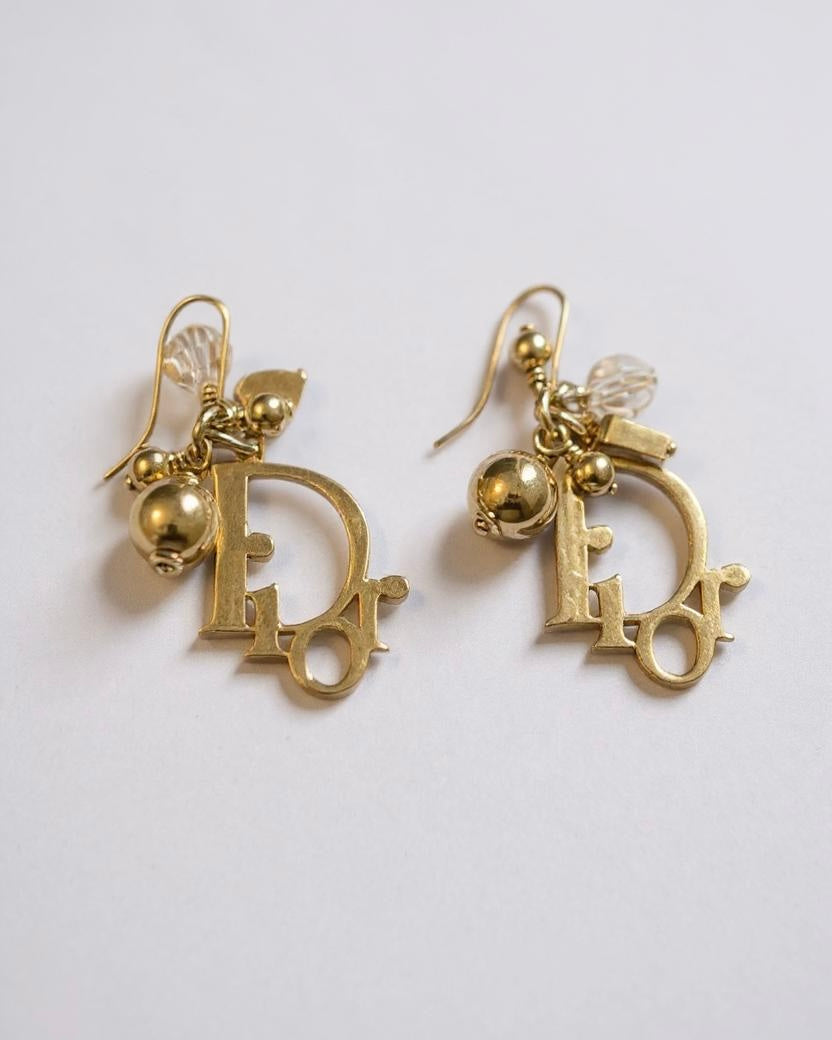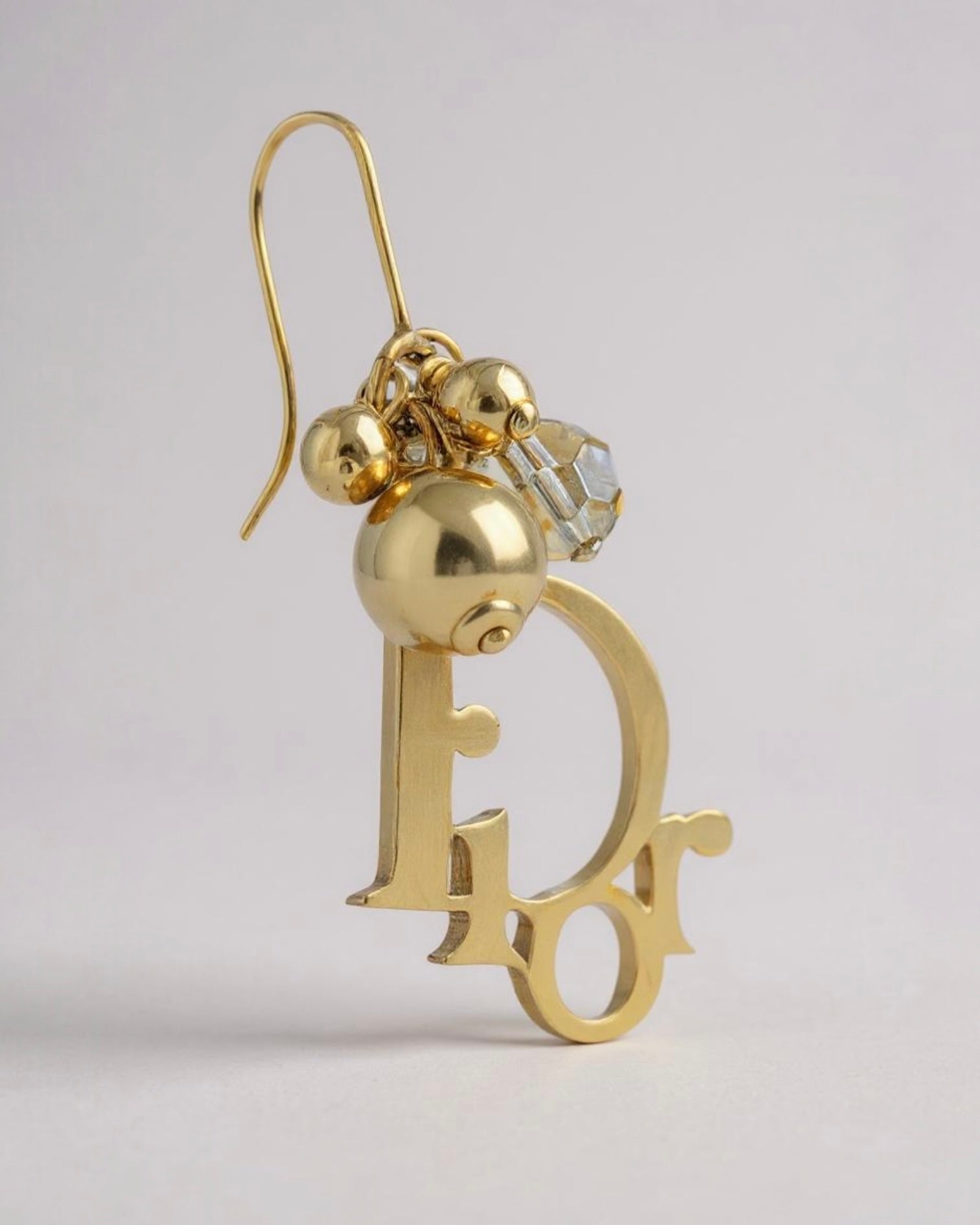These earrings are a playful yet elegant statement piece. Crafted in gold-tone metal, they feature the iconic “Dior” logo charm in a bold, sculptural font, suspended from classic French hook wires. Each earring is adorned with a cluster of chic accents—including a reflective gold bead and a faceted clear crystal bead—that add a touch of movement and light-catching sparkle.
