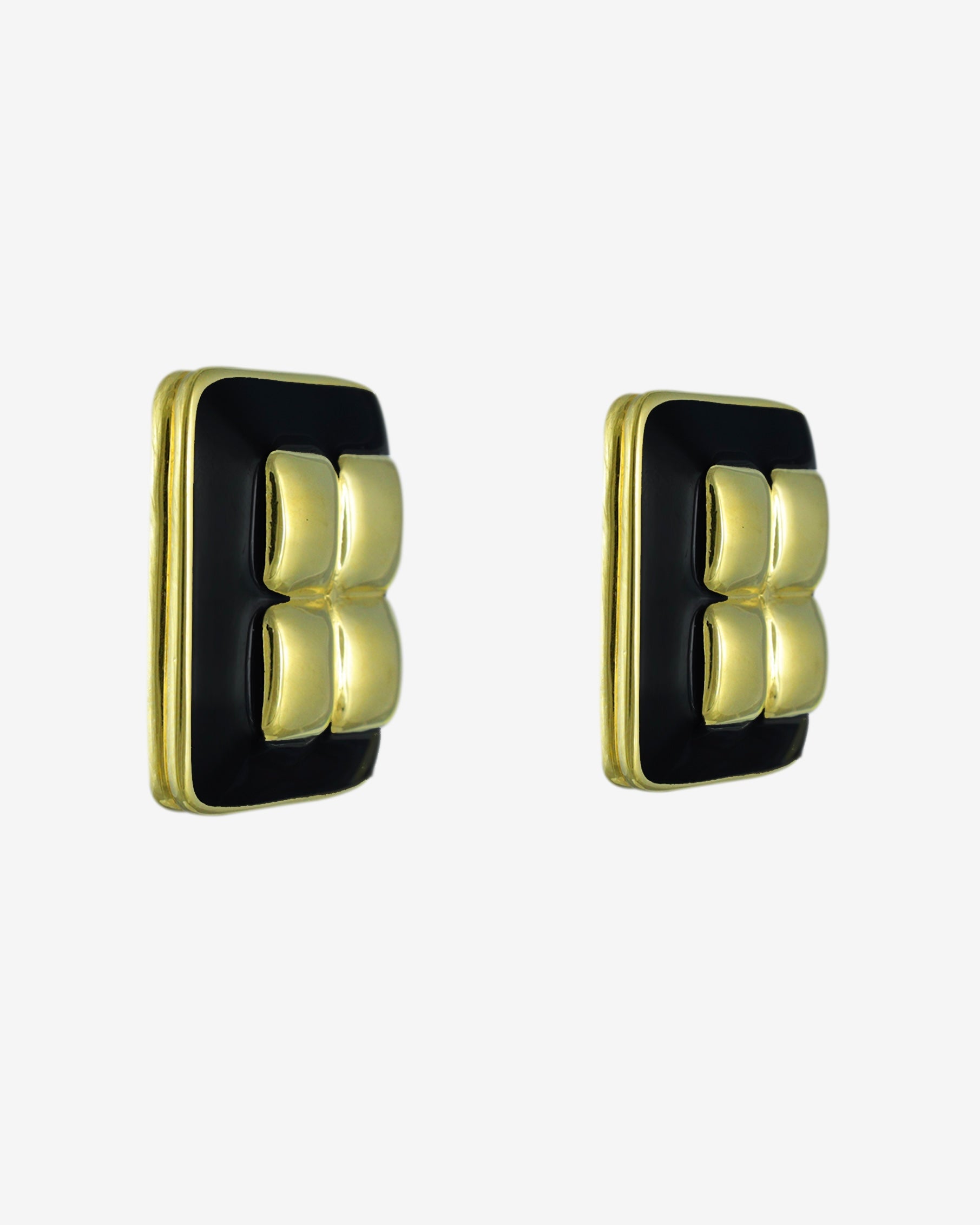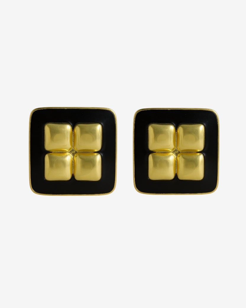 These vintage signed Nina Ricci clip-on earrings exude timeless elegance, featuring a luxurious triple yellow gold-plated finish with a rich black enamel quilted square design. Measuring approximately 2.54 cm x 2.54 cm (1” x 1”), they are a sophisticated and versatile accessory that effortlessly complements both casual and formal attire.
