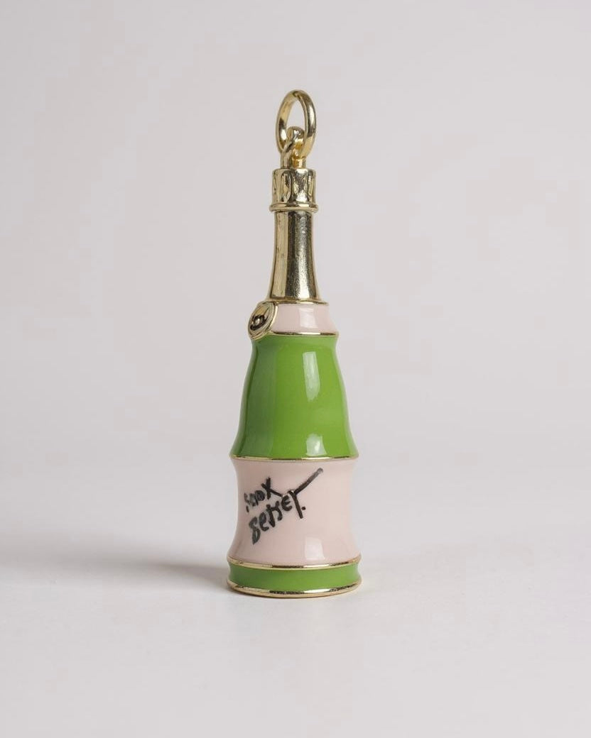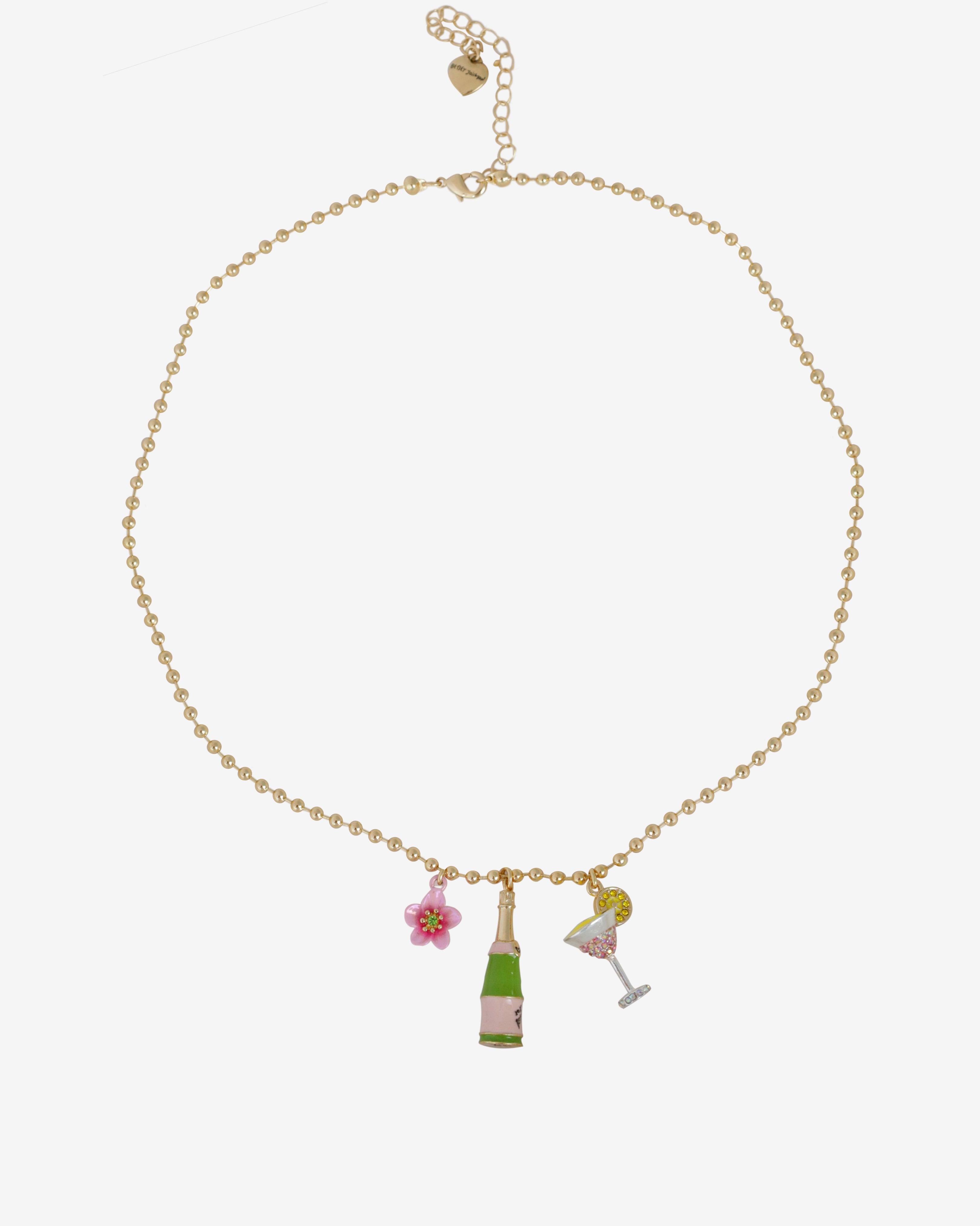 This playful and glamorous charm necklace by Betsey Johnson features a delightful mix of fun and sparkle. Hanging from a gold-tone beaded chain, the charms include a pink and green champagne bottle, a crystal-encrusted martini glass with a lemon slice, and a delicate pink flower with a green gem center. The combination of enamel details and shimmering rhinestones captures Betsey Johnson’s signature whimsical and bold aesthetic, making it a perfect statement piece for any celebration or stylish occasion.