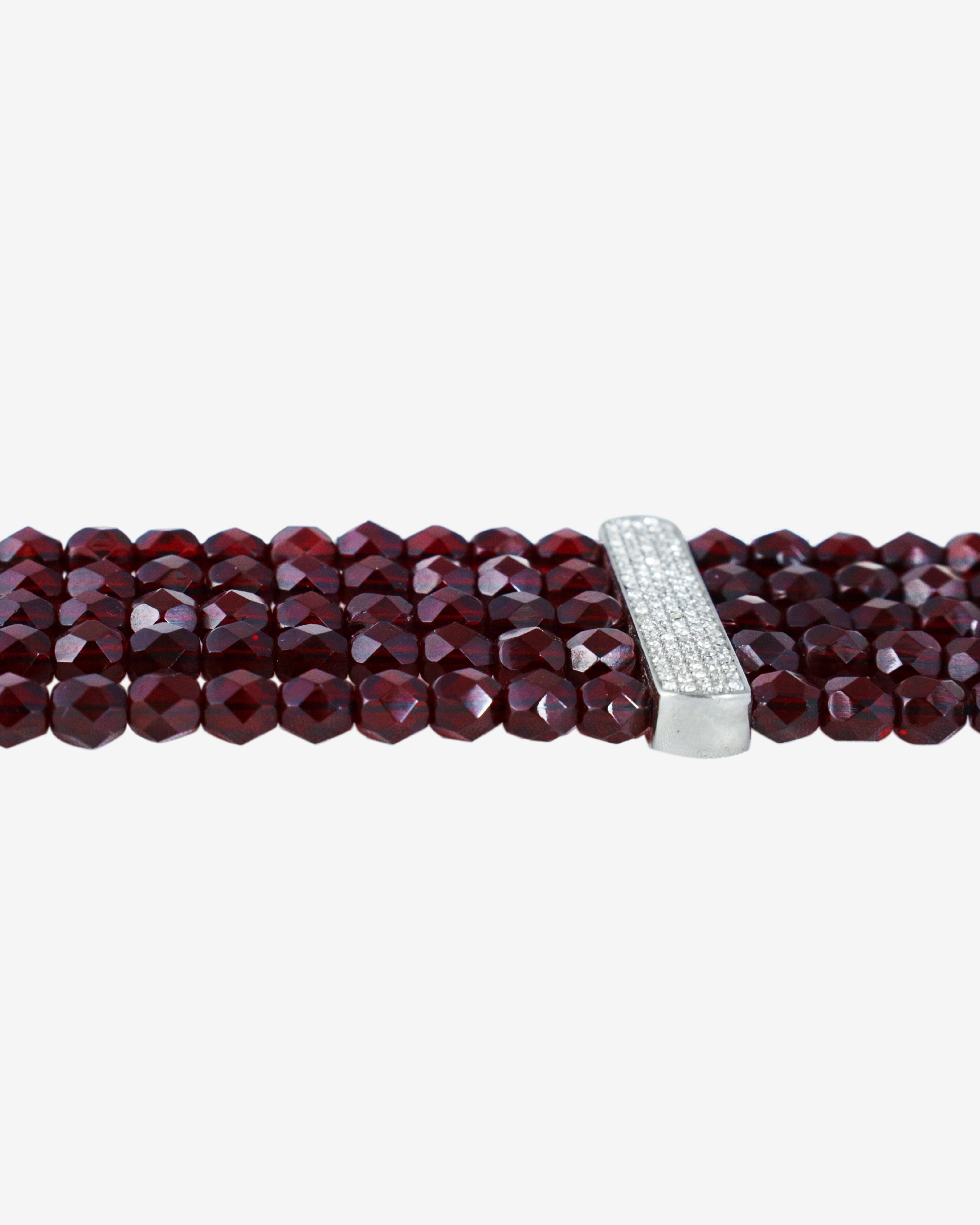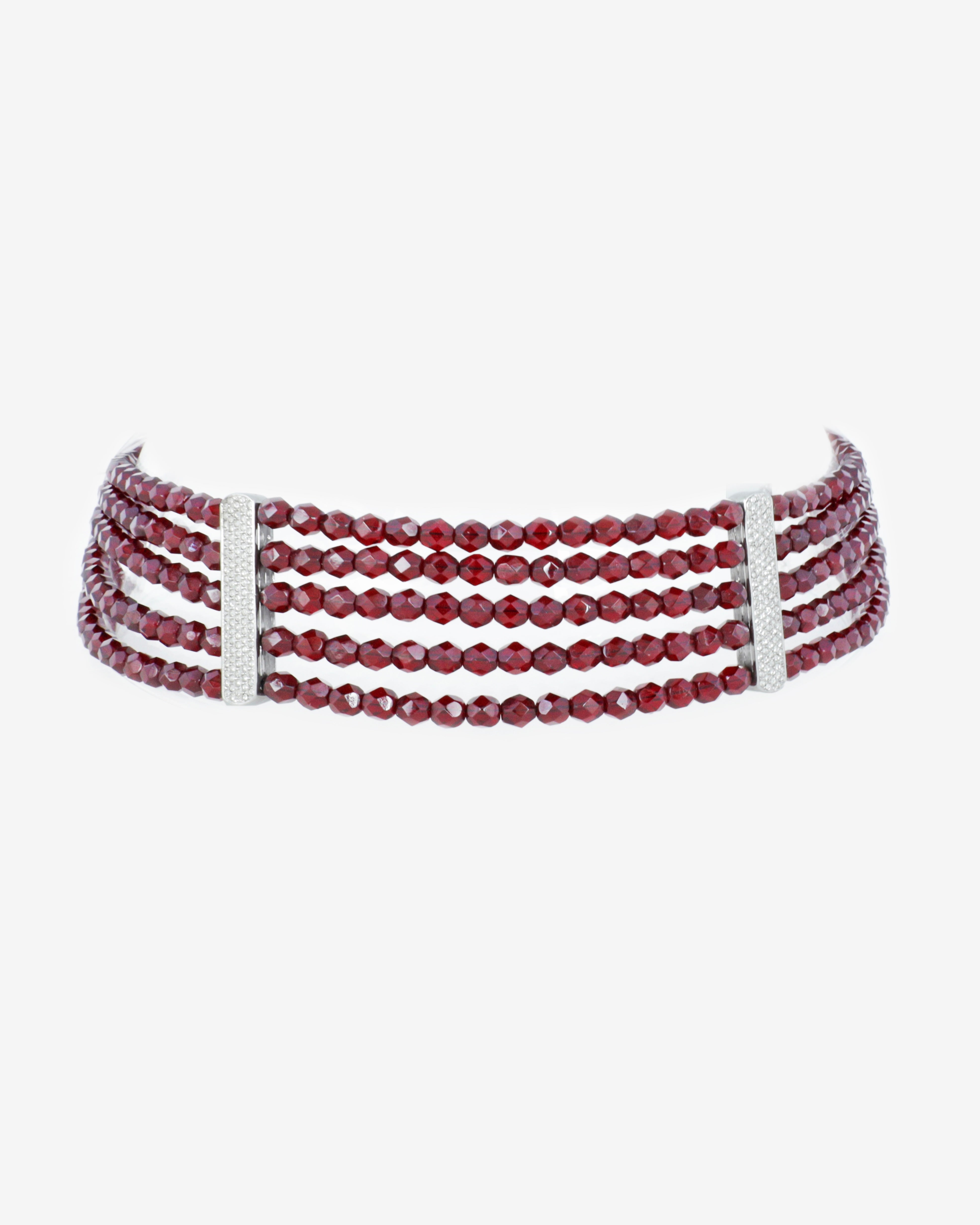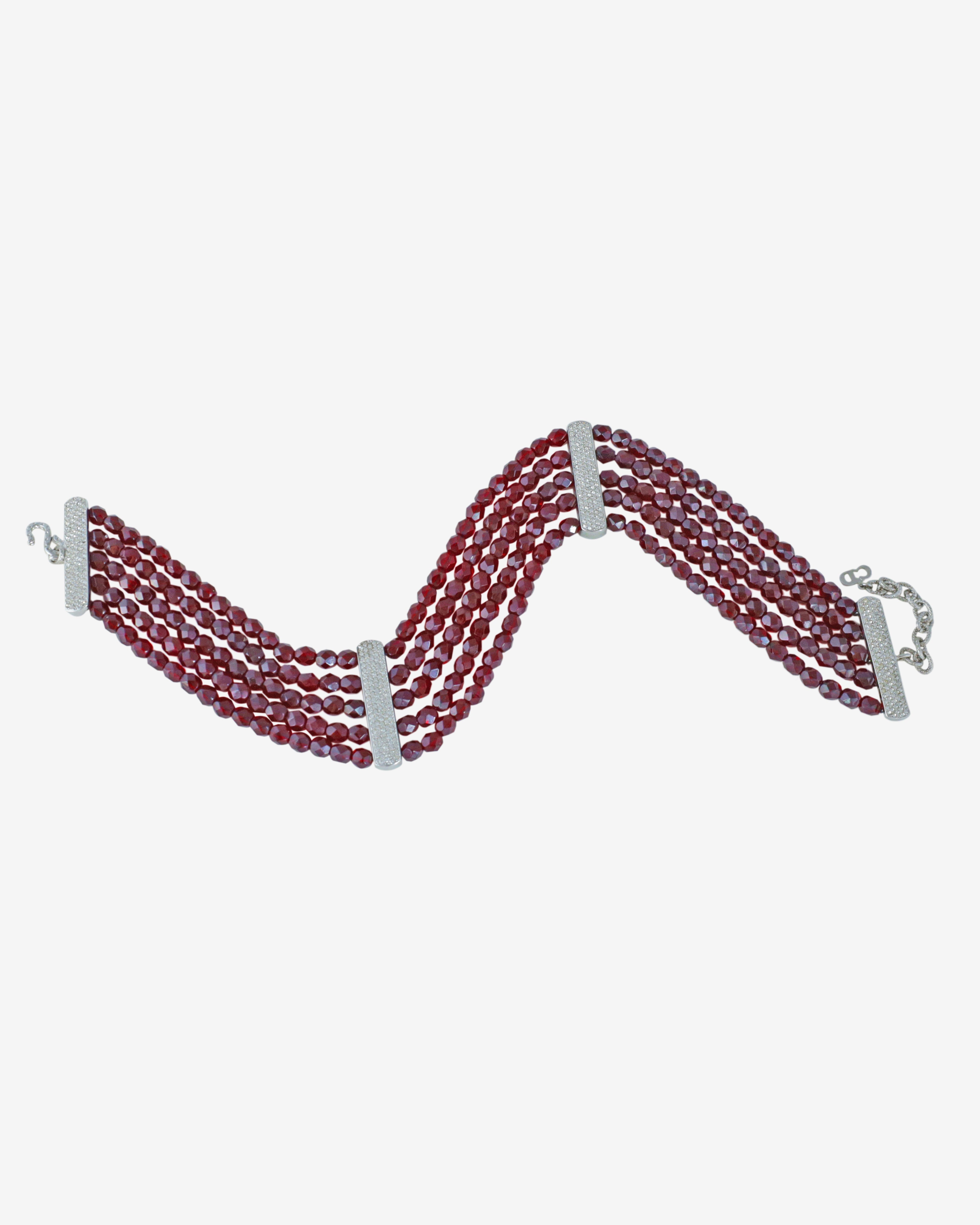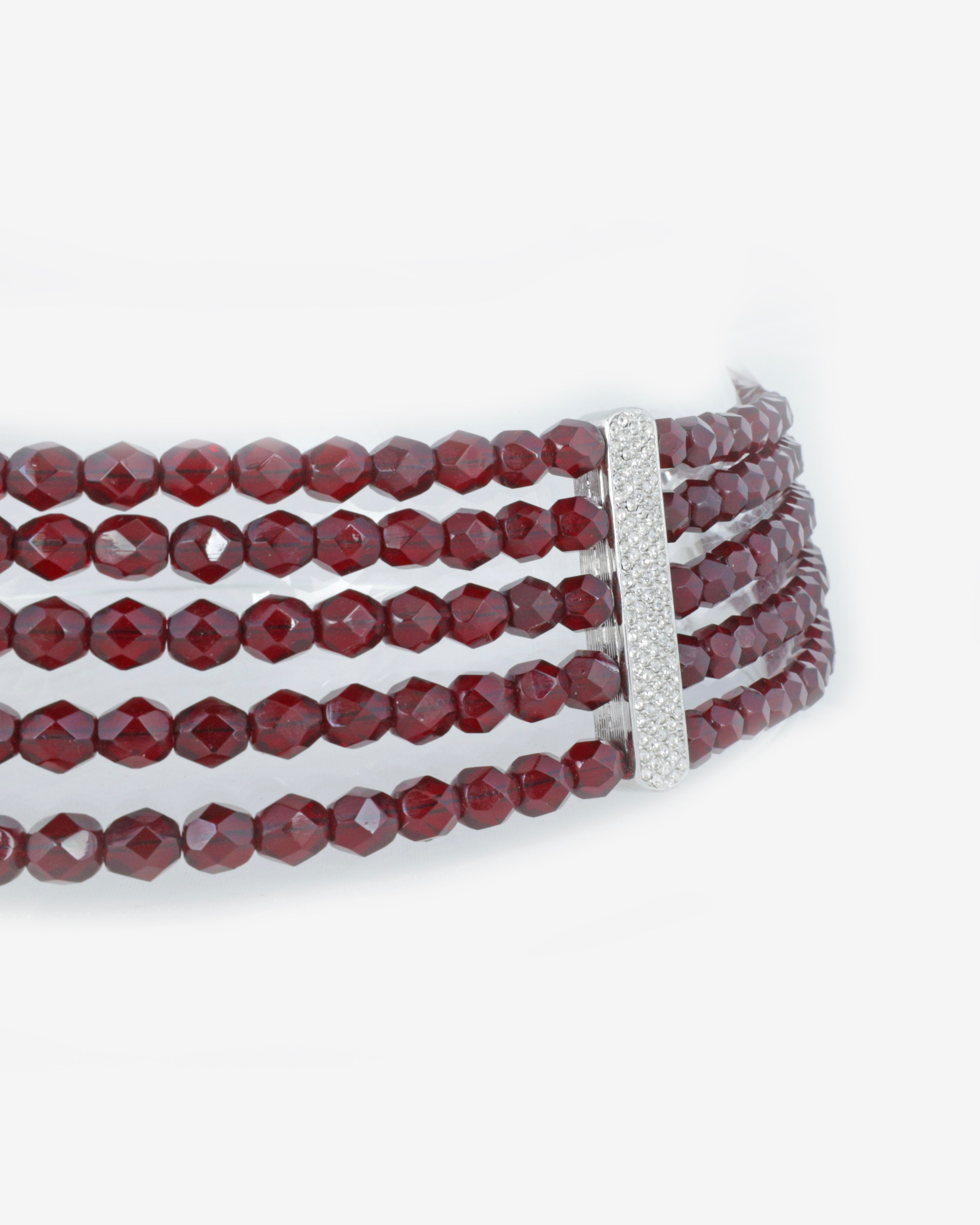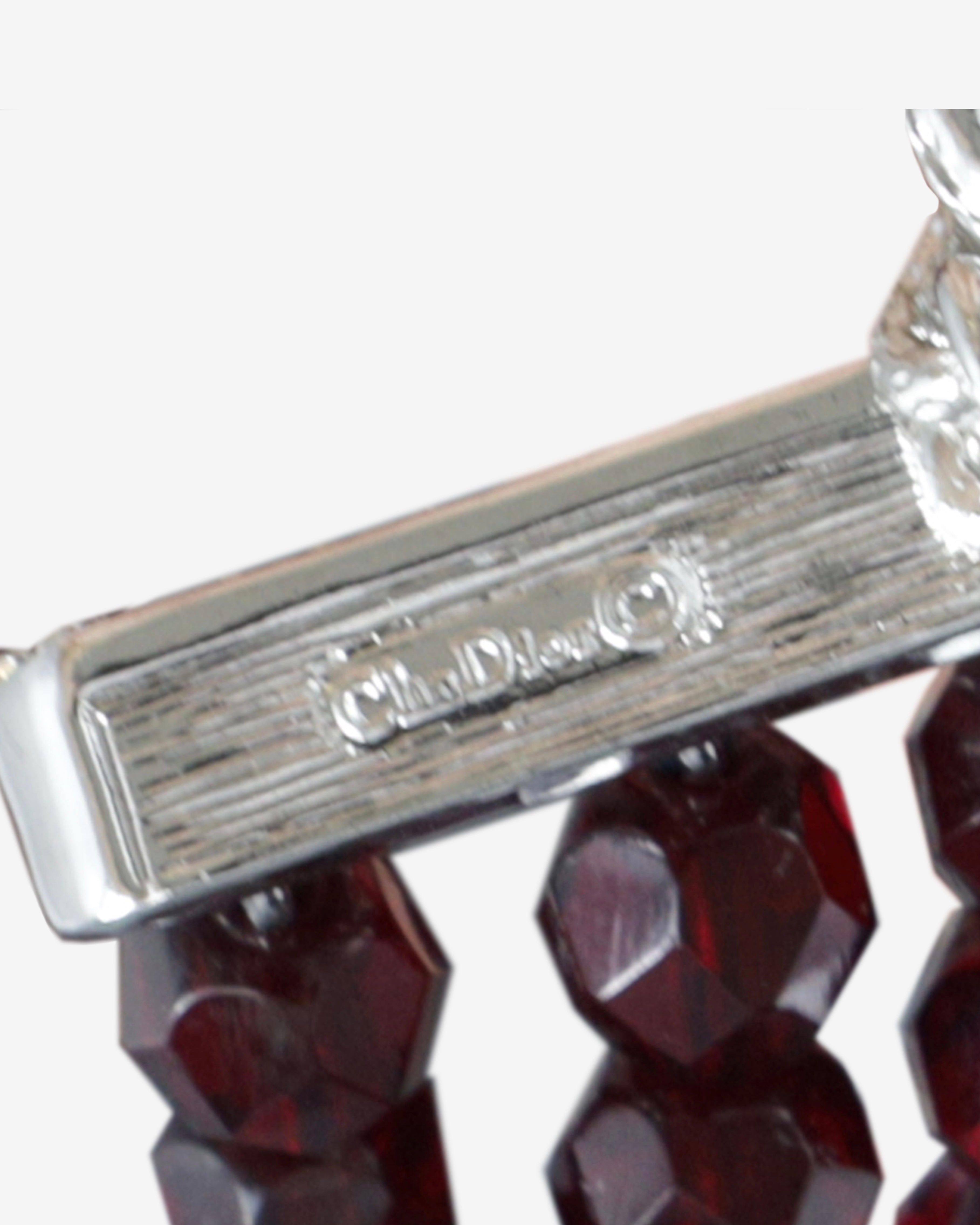 Step into the world of luxury with this exquisite 1980s Vintage Christian Dior Signed Burgundy Crystal Beads Choker Necklace. Featuring five stunning strands of rich burgundy red crystal beads, this piece is a true statement accessory. Model number D27903, it measures 13 inches in length with a 2-inch extension, allowing for a versatile fit of up to 15 inches. Each bead measures 3/16 inch in diameter, creating a delicate yet impactful look.