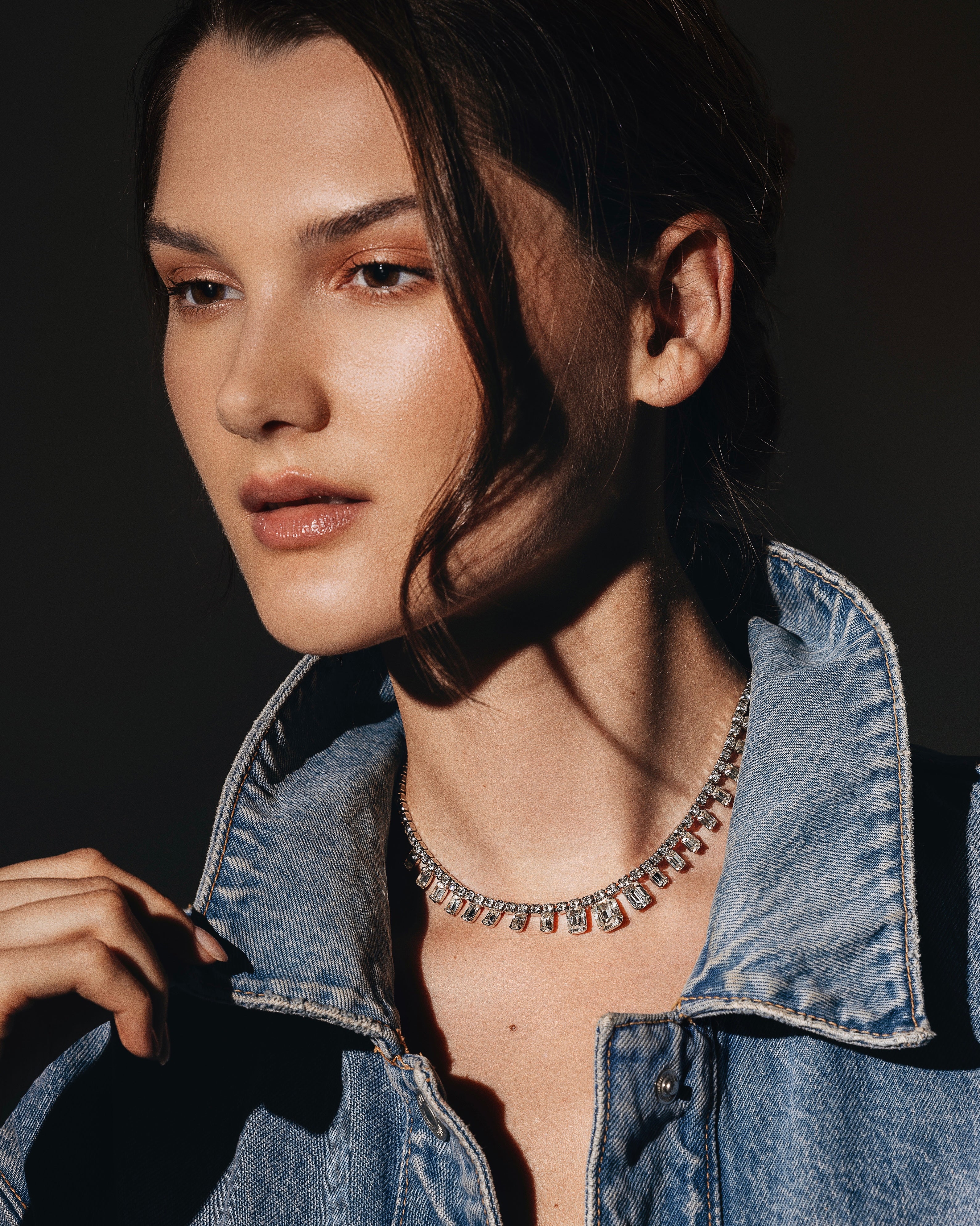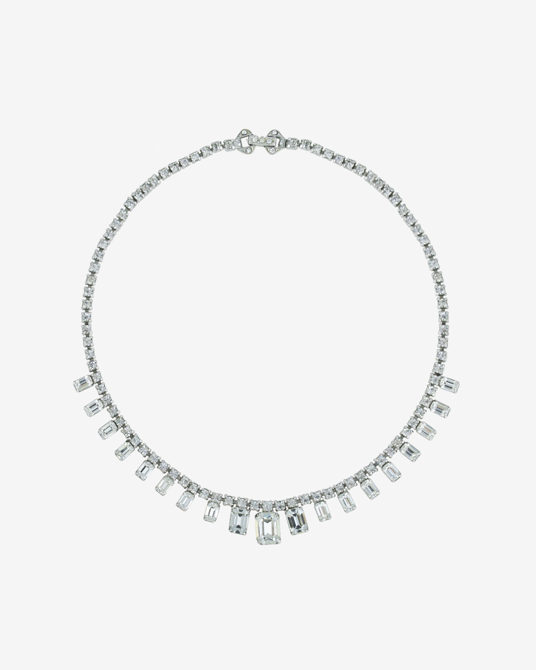 This necklace captures the essence of that golden era, where fashion was bold, and accessories were crafted to make a statement. With its luxurious emerald-cut stones and silver-tone setting, it effortlessly blends vintage charm with modern elegance.