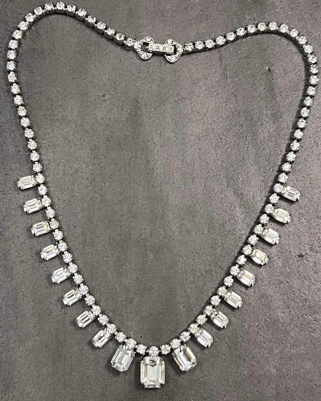 Kramer of New York was renowned for crafting exquisite costume jewelry that rivaled fine jewelry in elegance and quality. This stunning 1960s necklace showcases their signature brilliance with dazzling emerald-cut glass stones set in a sleek silver-tone design.