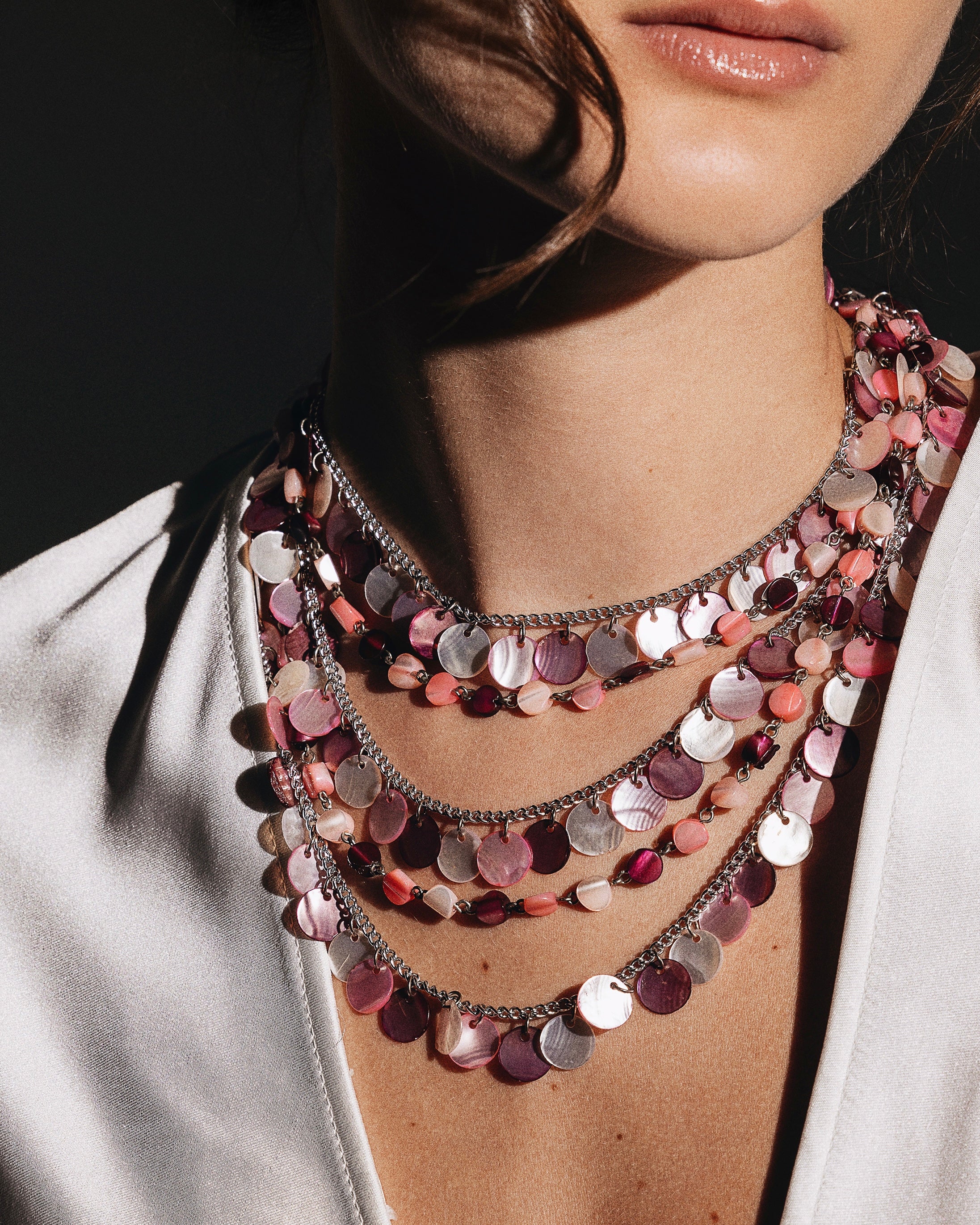 Japan Signed Multi-Strand Necklace – Pink & White Shell Disc Layers Statement