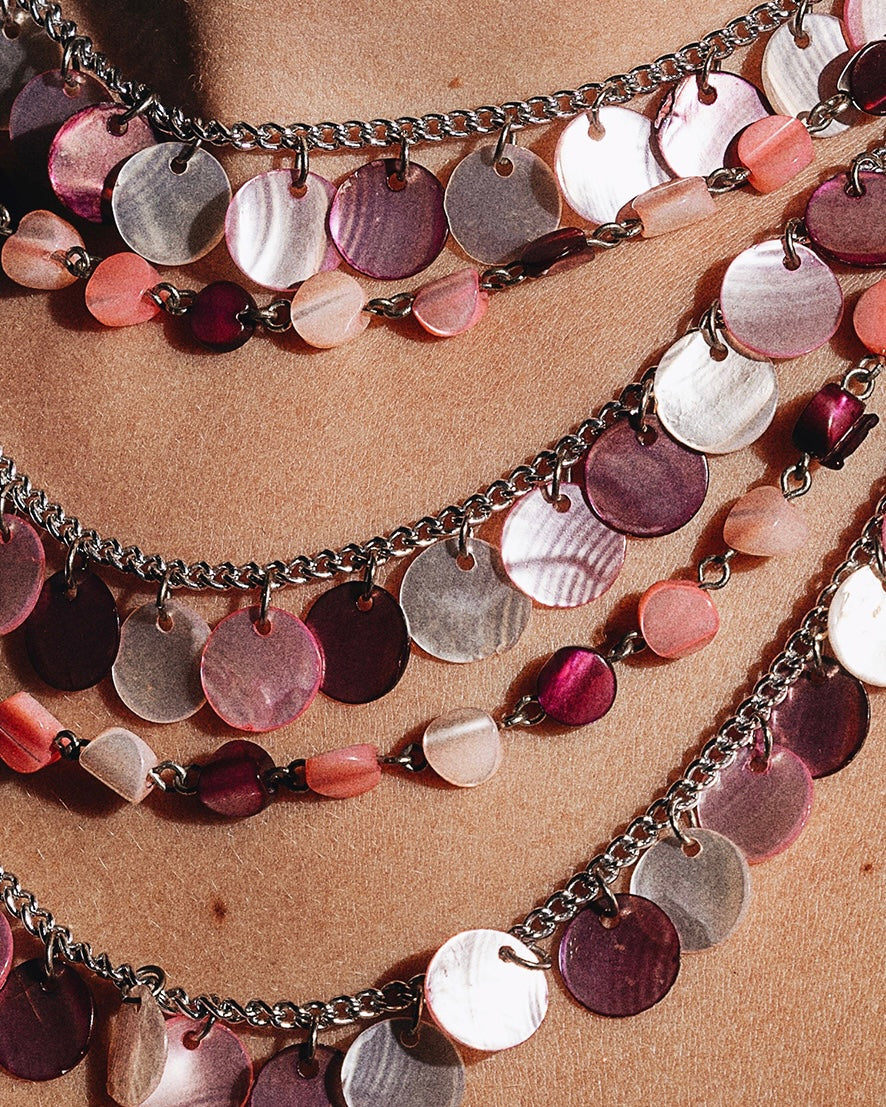 Step into a world of bohemian elegance with this beautiful Vintage Multi-Strand Necklace, clearly signed 'Japan'. This captivating piece, likely from the mid-to-late 20th century (circa 1960s-1980s), features multiple graceful strands adorned with an array of polished shell or mother-of-pearl discs in various shades of pink, purple, and white. Interspersed with coordinating beads, the layered design creates a lovely cascade of color and texture that drapes beautifully. Japanese costume jewelry from this era is renowned for its quality and distinctive aesthetic, often incorporating natural elements. This necklace is perfect for adding a touch of vibrant, natural charm to both casual and more dressed-up ensembles, embodying a free-spirited yet sophisticated style.