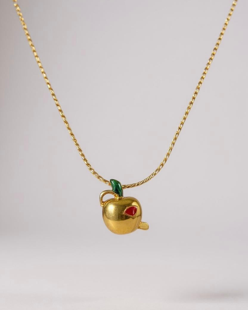 Indulge in a truly delightful statement piece with this authentic vintage necklace, featuring an exquisitely imaginative apple pendant. Crafted in a gleaming gold tone, the apple is playfully adorned with vibrant red enamel lips, adding a whimsical yet sophisticated touch. A small, vibrant green enamel leaf elegantly crowns the apple, completing its charming form. The entire pendant hangs from a delicate yet sturdy gold-toned chain, ensuring a graceful drape around the neckline.