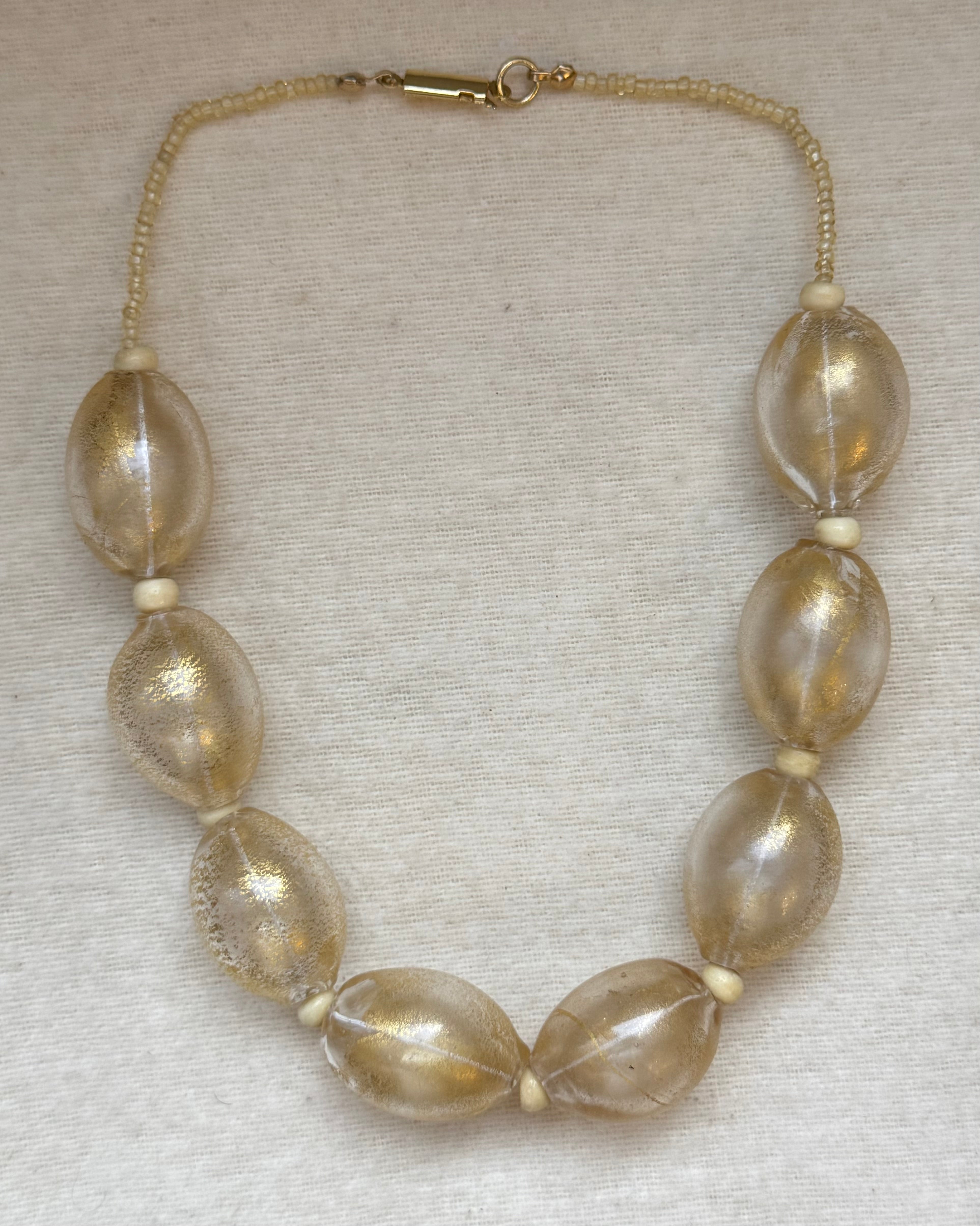 Today, necklaces like this one are considered collectible, valued for both their craftsmanship and historical connection to Murano’s golden age of glass artistry. Larger gold-foil beads, as seen here, are especially prized by collectors, making this necklace not only a beautiful accessory but also a piece of wearable art with enduring cultural significance.