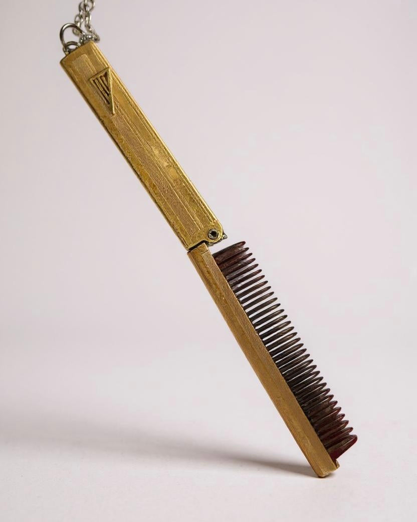 Discover the epitome of refined practicality with this captivating authentic vintage necklace, featuring a meticulously crafted folding comb pendant. Rendered in a lustrous gold tone, this ingenious piece seamlessly blends discreet grooming functionality with sophisticated adornment. The comb element is ingeniously designed to fold neatly within its elegant case, ensuring both convenience and a sleek aesthetic. It hangs gracefully from a delicate yet sturdy gold-toned chain, ready for any occasion.