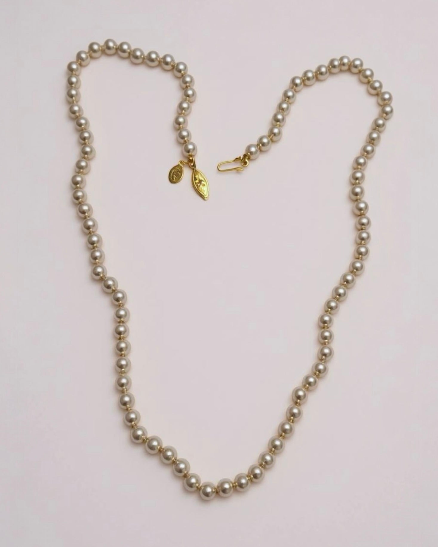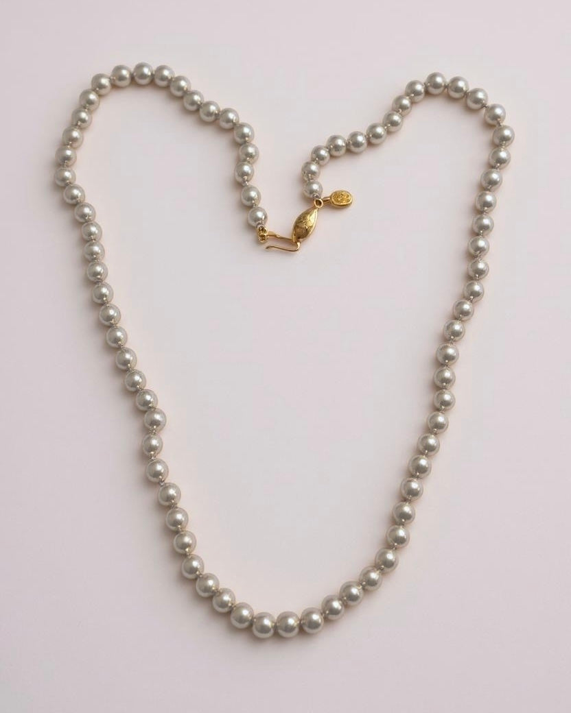Step into the sophisticated style of the 1980s with this elegant vintage Napier necklace, featuring lustrous faux pearls. This classic single-strand necklace showcases perfectly round faux pearls with a beautiful, creamy luster, creating a timeless and versatile look. The pearls appear to be uniformly sized, giving the necklace a consistent and polished appearance.