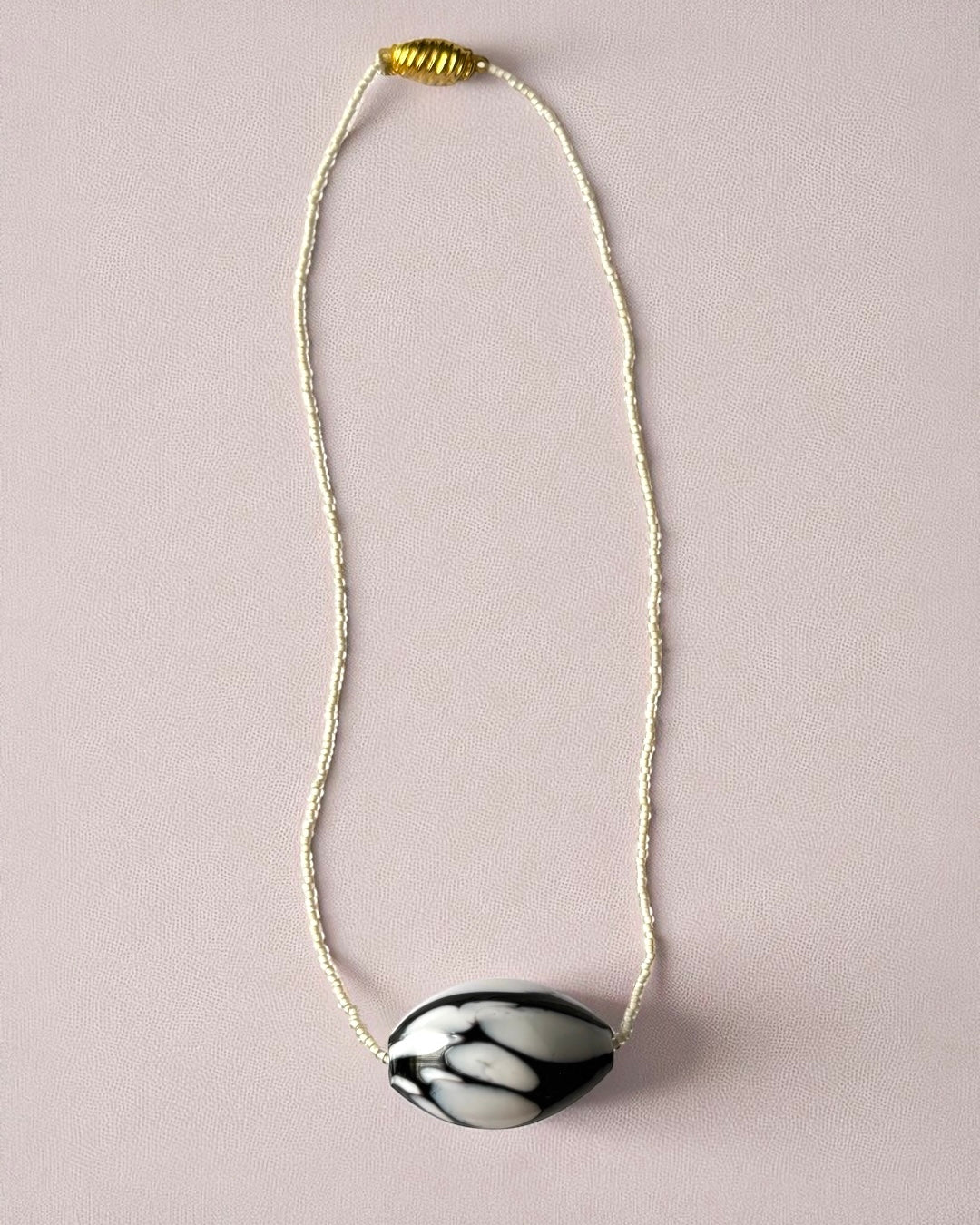 This artistic necklace features a bold Murano glass pendant bead in soft lavender tones, enhanced with swirling black ribbon-like patterns encased in clear glass. The pendant is suspended from a delicate strand of fine white seed beads, finished with a vintage-style gold-tone fishhook clasp. The balance of a dramatic centerpiece and subtle strand creates a refined yet striking composition, perfect for both everyday wear and special occasions.