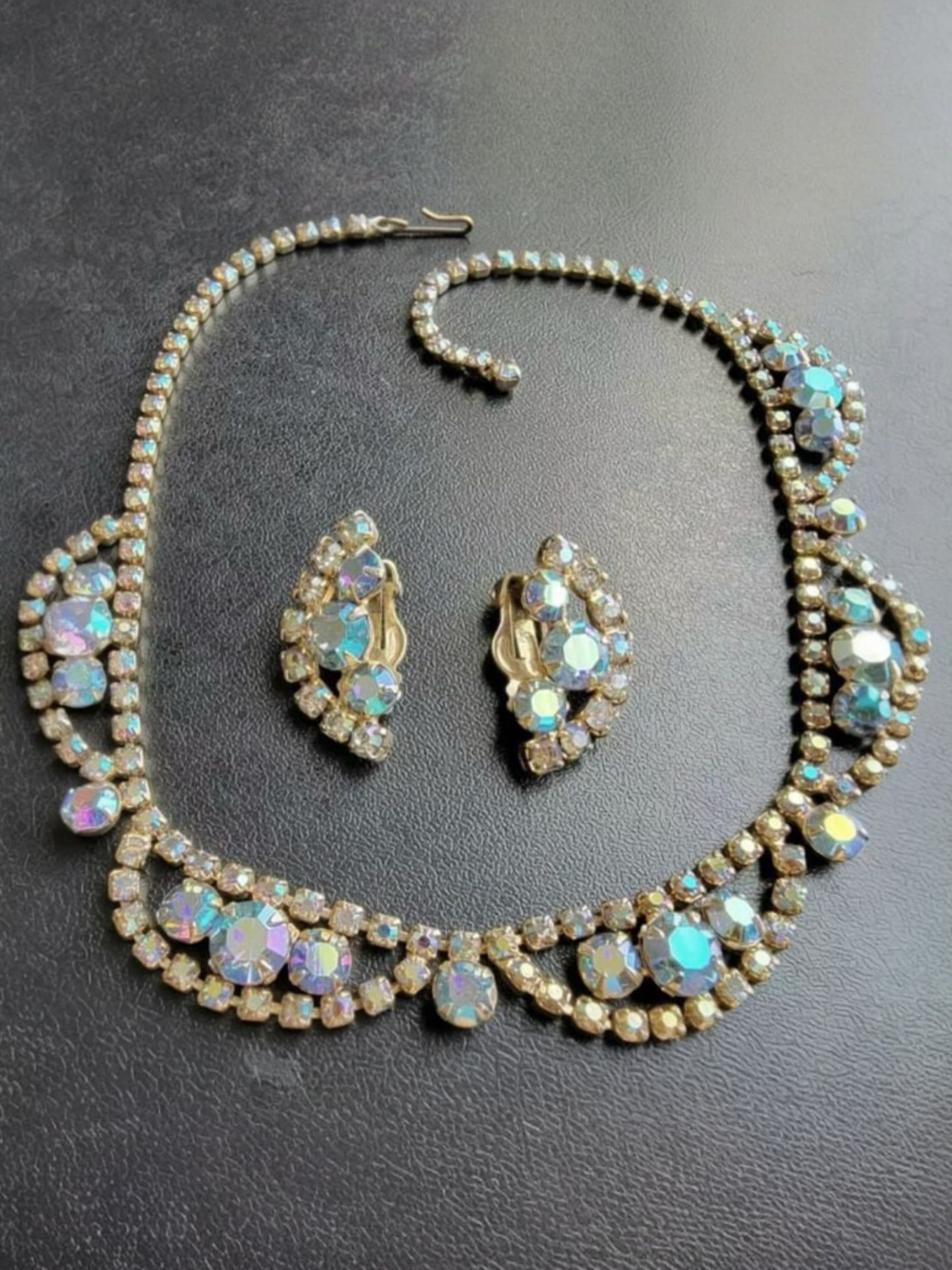 This set is a beautiful example of mid-20th century costume jewelry, crafted during the golden age of American and European fashion jewelry — an era when elegance was accessible to every woman. The Aurora Borealis coating, developed in 1955 by Swarovski in partnership with Christian Dior, revolutionized fashion jewelry. It gave stones a rainbow-like sheen, reminiscent of the northern lights — hence the name.