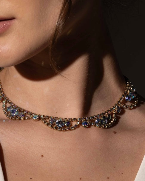 Dazzle in timeless mid-century glamour with this exquisite vintage jewelry set, featuring a cascading swag necklace and matching clip-on earrings. Each piece is adorned with brilliant Aurora Borealis (AB) coated rainbow paste glass stones that shimmer with iridescent hues — from delicate lilacs and blues to fiery golds and greens — depending on how the light hits.
