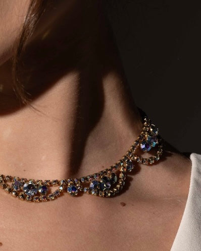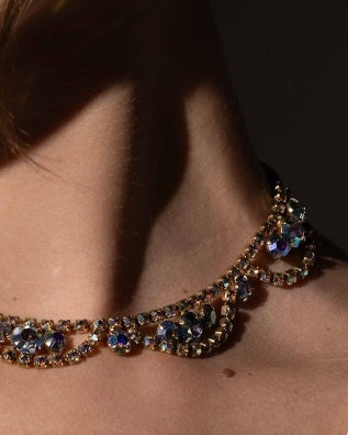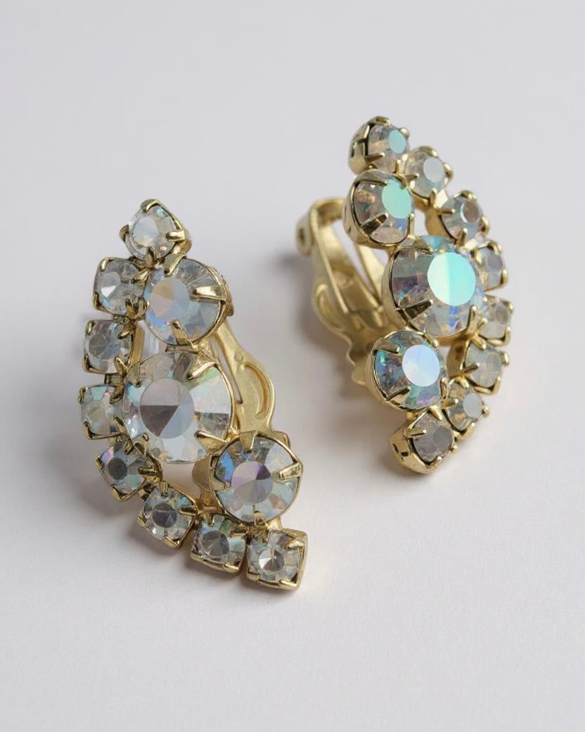 Paste glass (high-lead crystal glass) was widely used to imitate precious stones with remarkable brilliance. Swag necklaces, popular in the 1950s and early 60s, added drama and femininity to evening wear. Clip-on earrings, also typical of the time, made it easy to match statement pieces without requiring pierced ears.