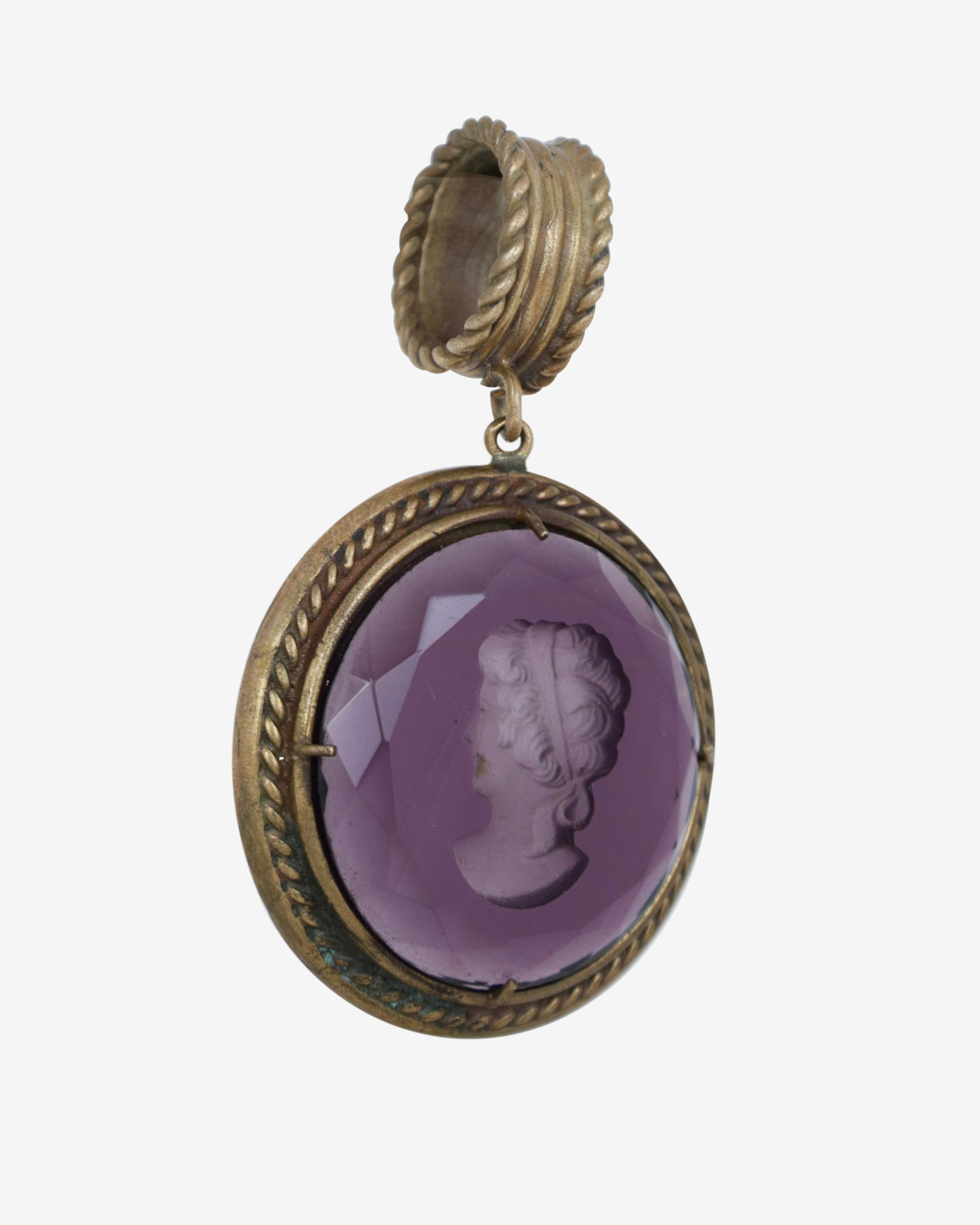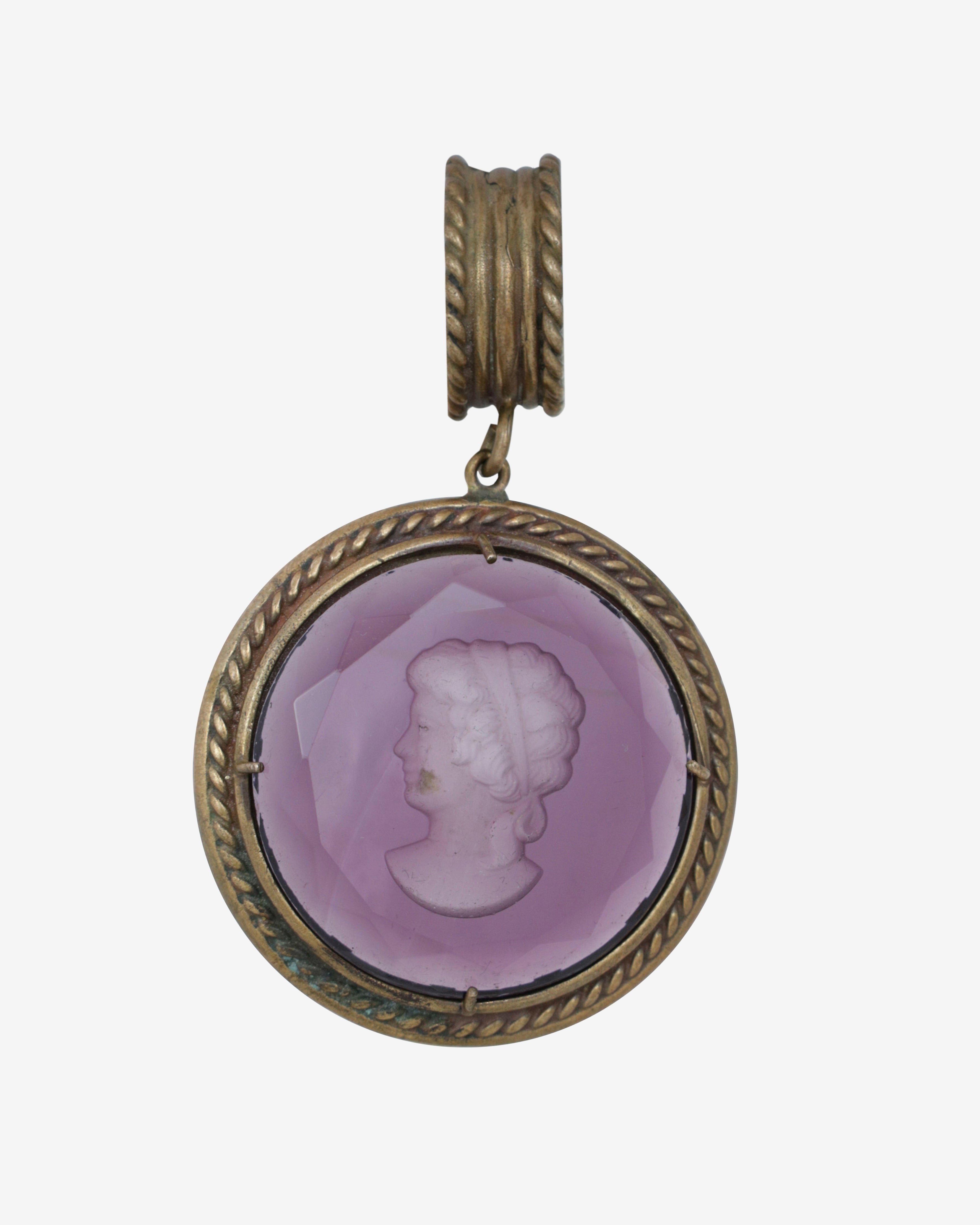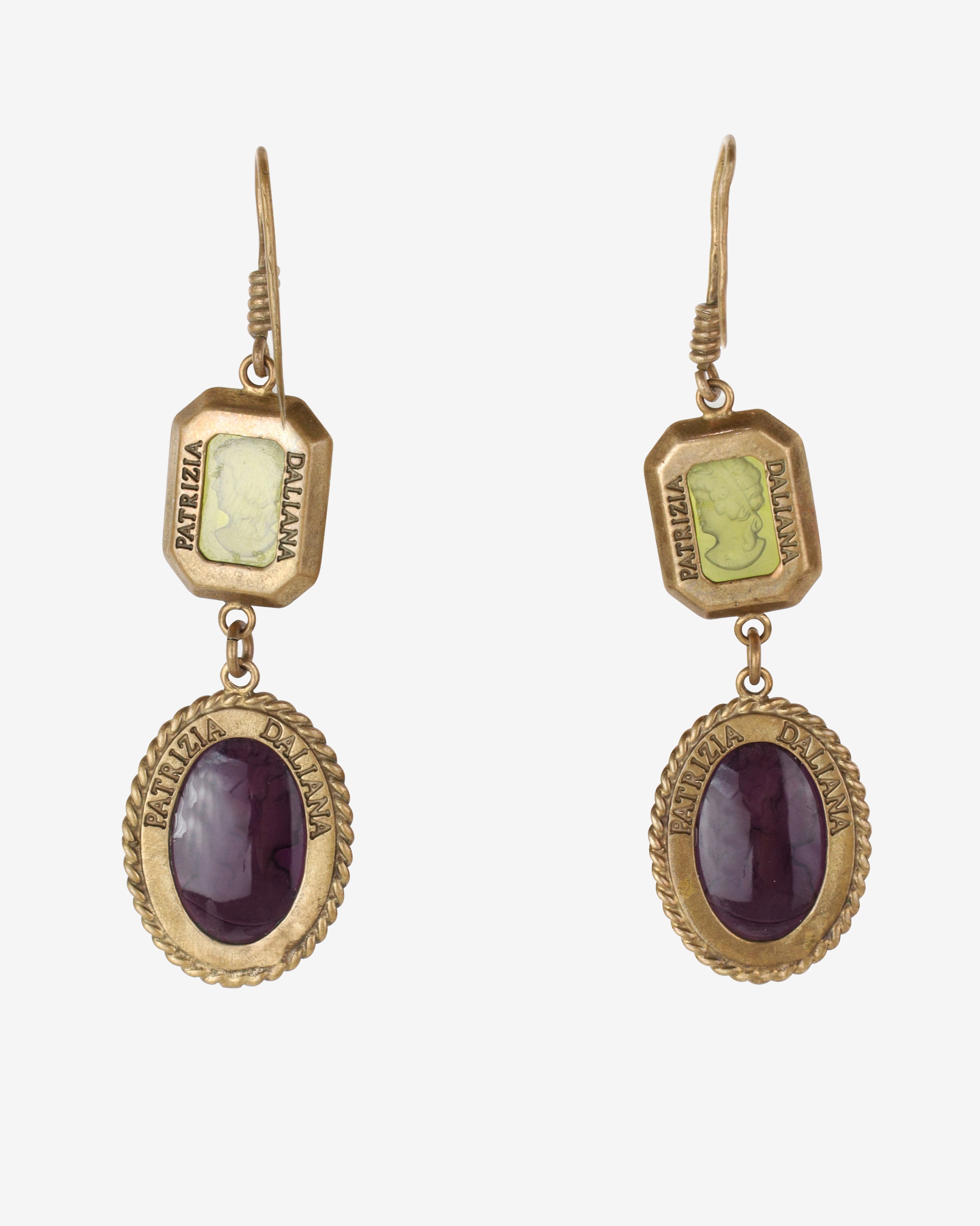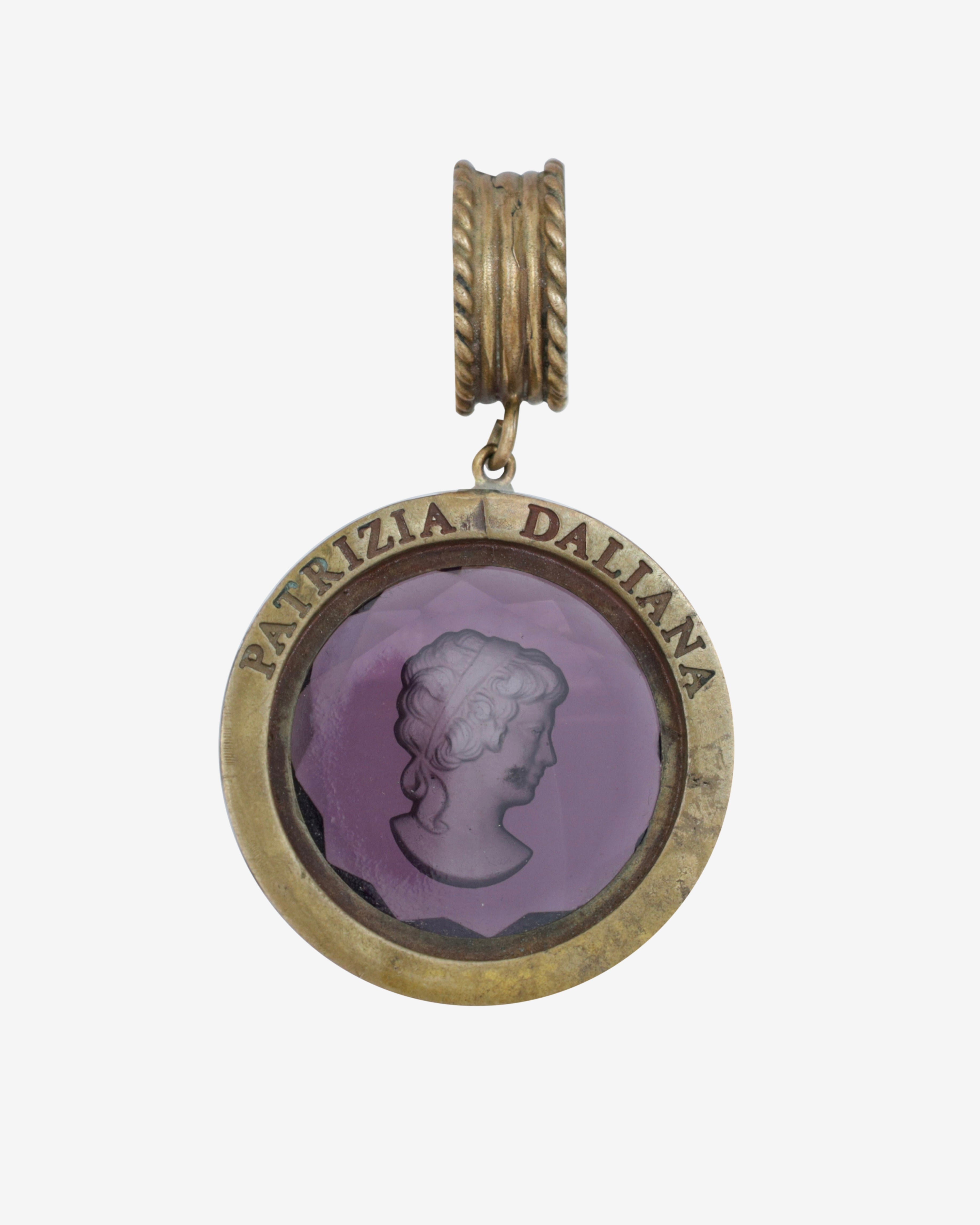 Step into a world of elegance with this stunning Vintage Patrizia Daliana set, featuring a hand-engraved glass cameo bracelet, pendant, and earrings. The gorgeous 9-inch long Florentine bracelet showcases four large oval Murano glass cameos in enchanting amber, yellow, purple, and green hues. Each cameo, measuring approximately 1.5 inches, is intricately engraved with "Patrizia Daliana" on the back, adding a touch of authenticity to this exquisite ensemble. Crafted from pure bronze, this set not only dazzles the eye but also tells a story of artistry and history.