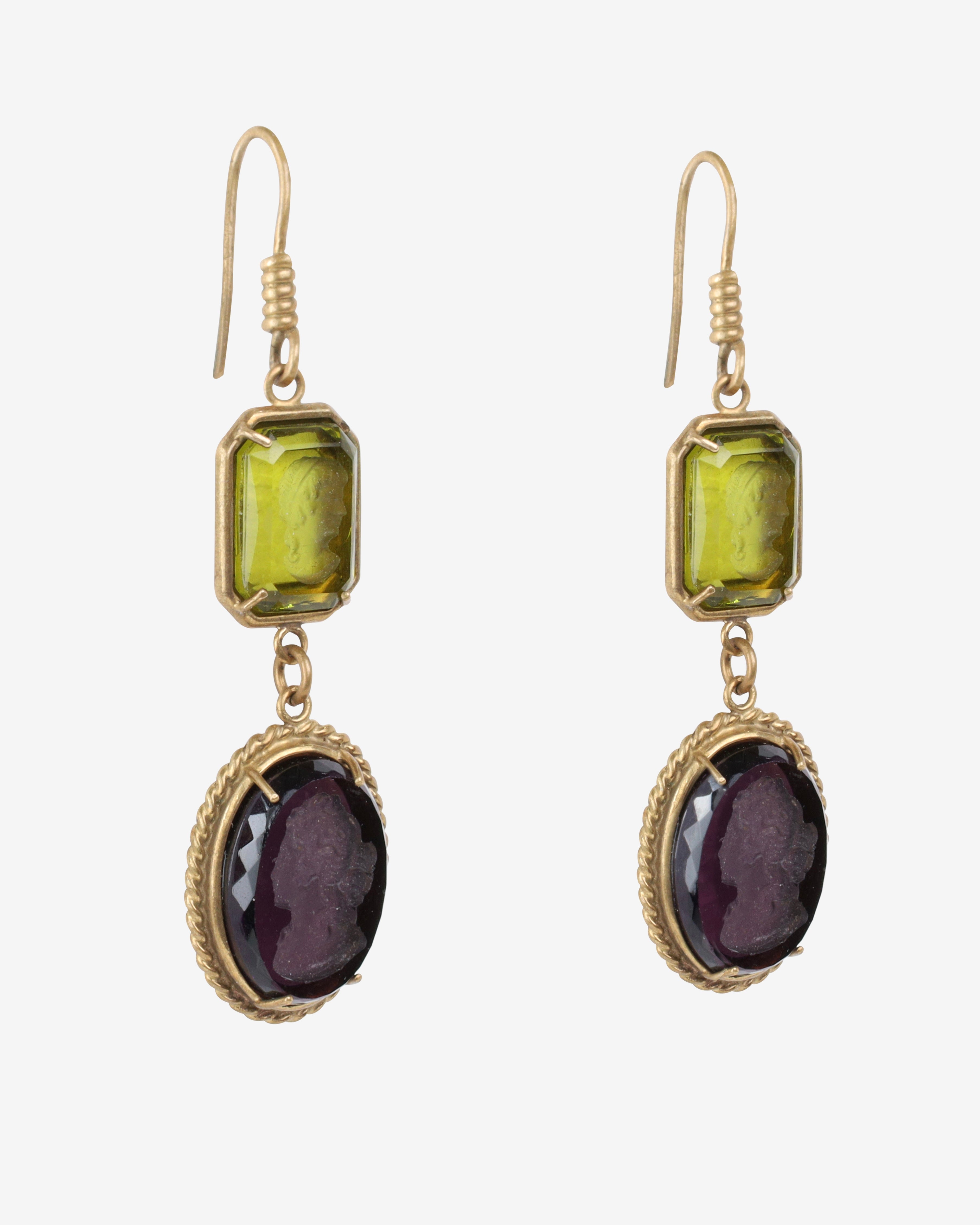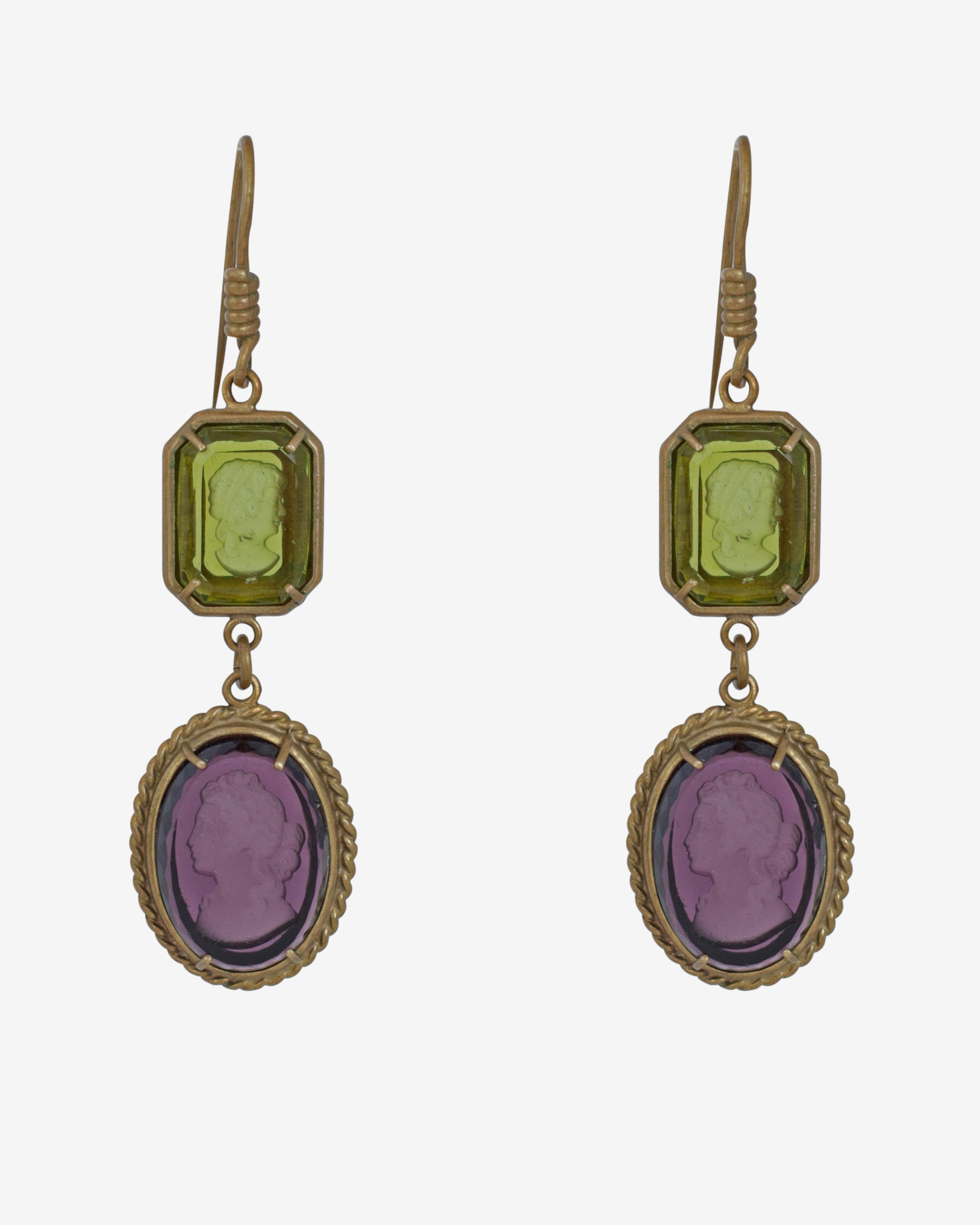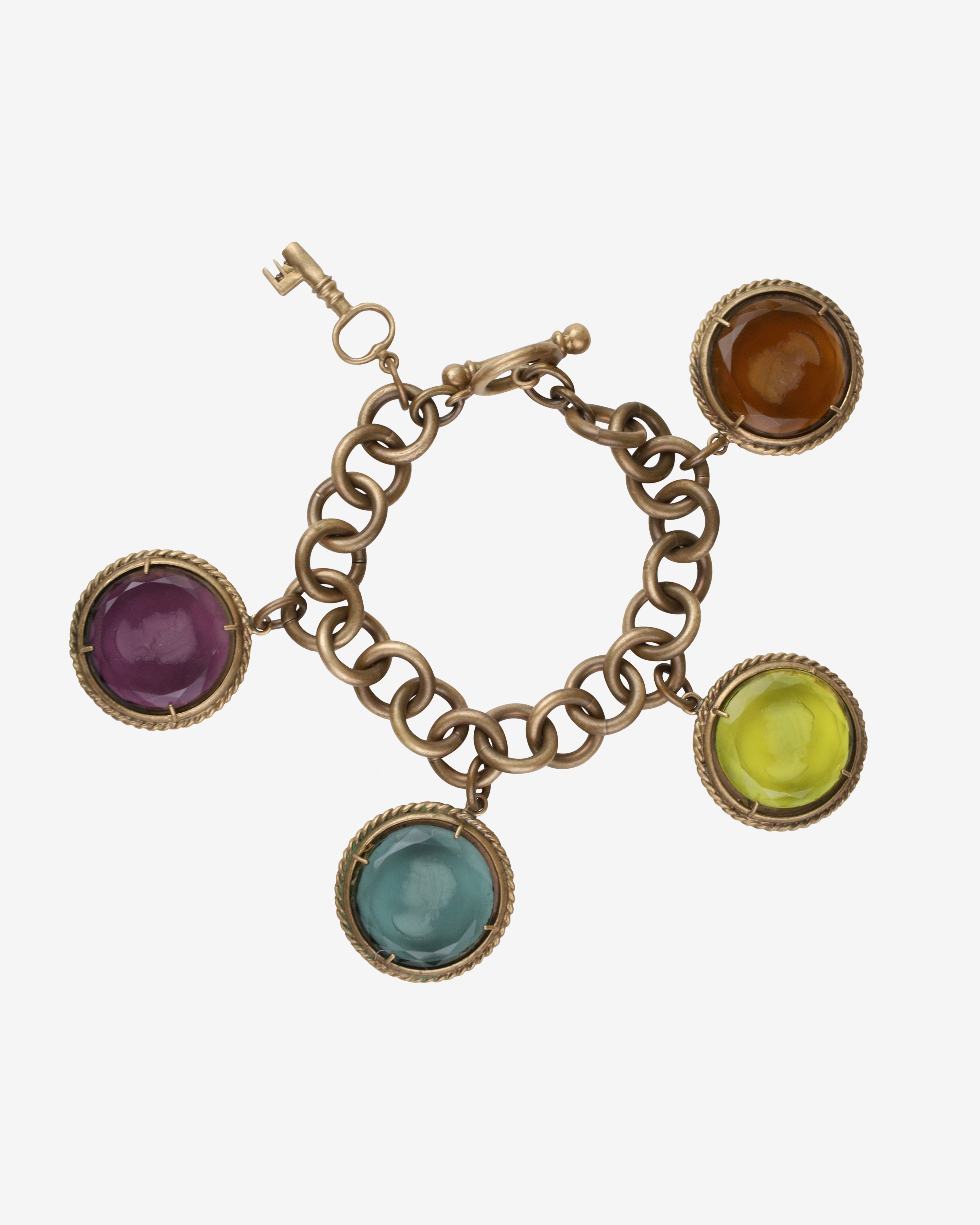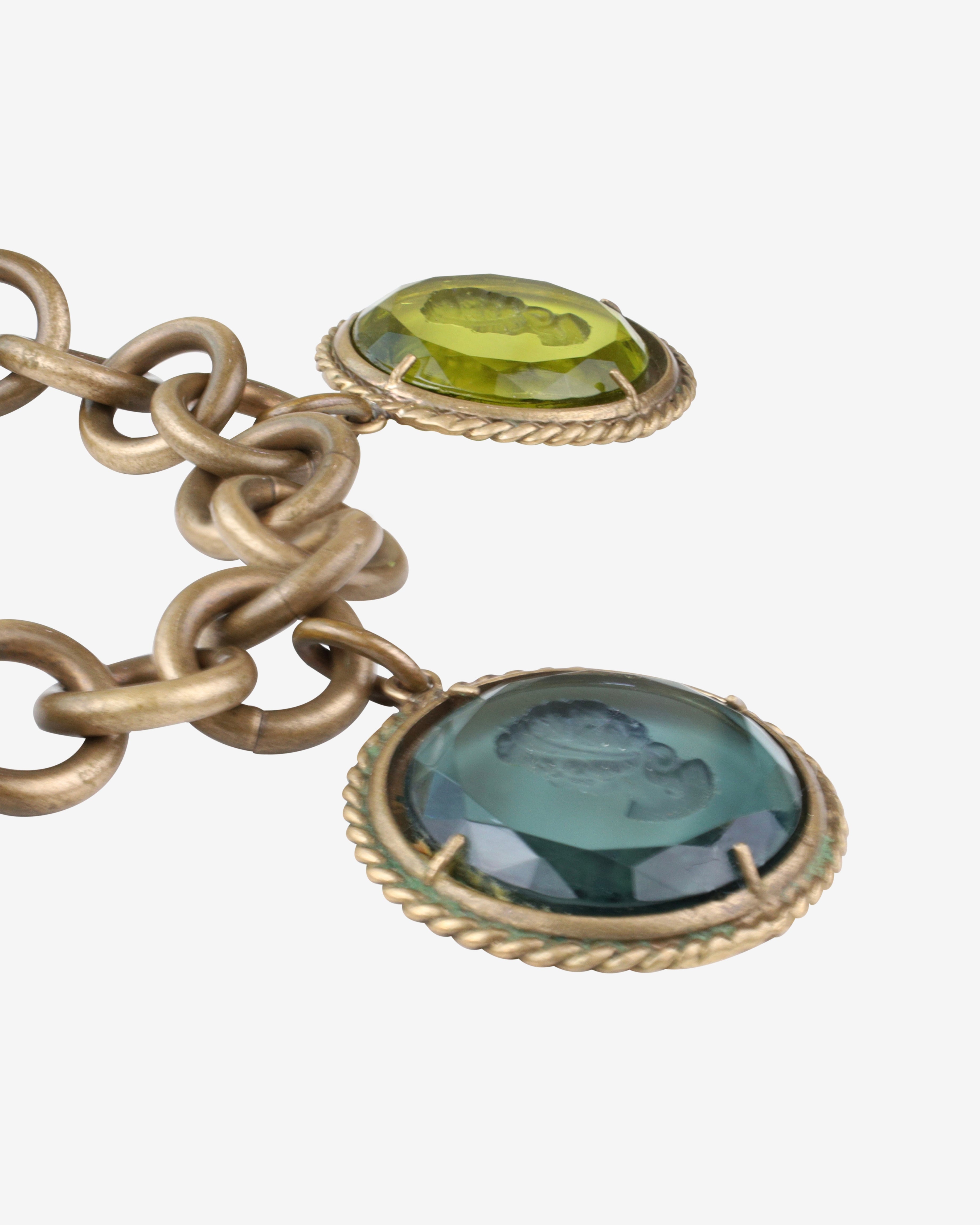 Step into a world of elegance with this stunning Vintage Patrizia Daliana set, featuring a hand-engraved glass cameo bracelet, pendant, and earrings. The gorgeous 9-inch long Florentine bracelet showcases four large oval Murano glass cameos in enchanting amber, yellow, purple, and green hues. Each cameo, measuring approximately 1.5 inches, is intricately engraved with "Patrizia Daliana" on the back, adding a touch of authenticity to this exquisite ensemble. Crafted from pure bronze, this set not only dazzles the eye but also tells a story of artistry and history.